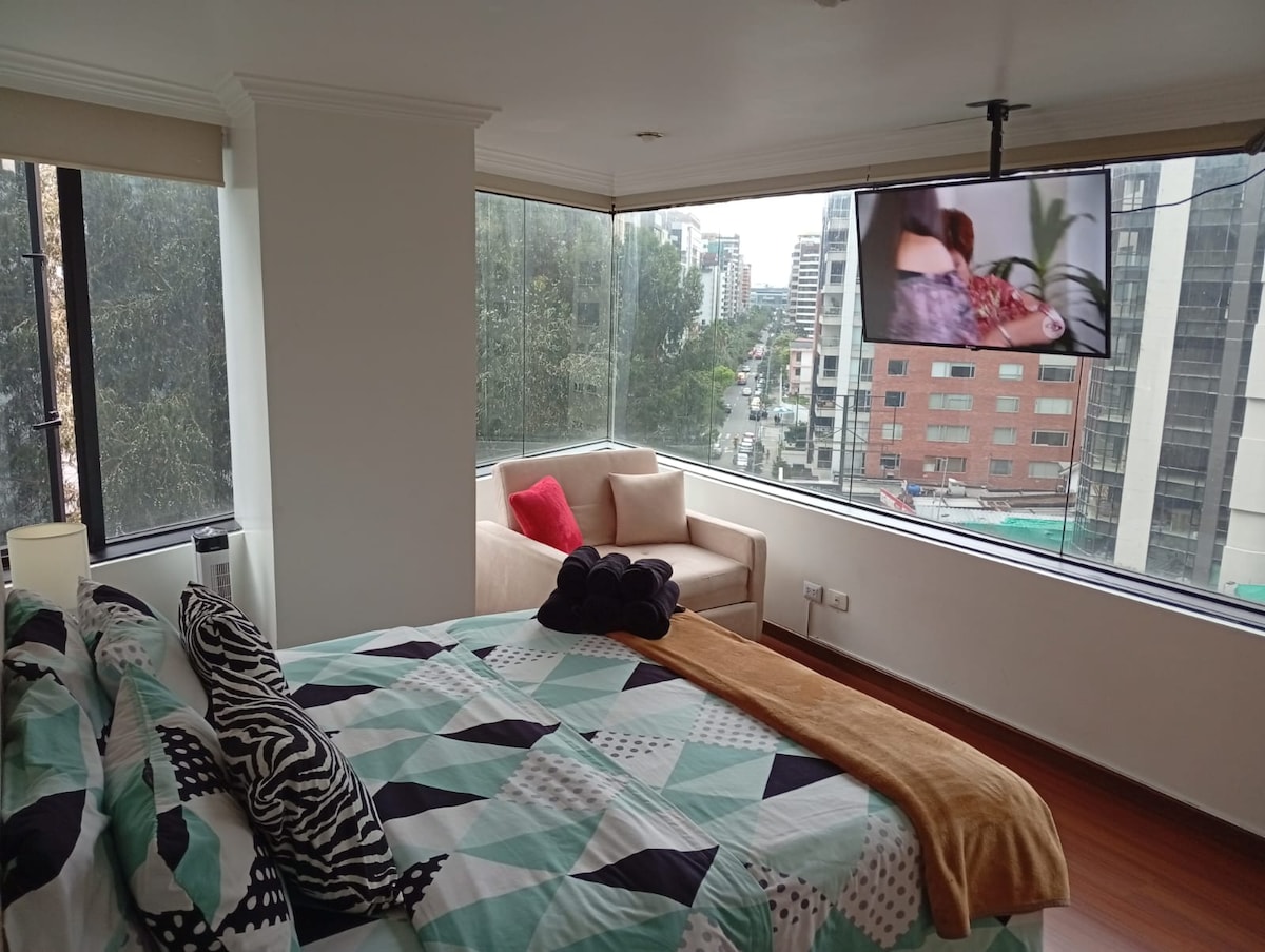 Disfruta de una experiencia con estilo en este alojamiento céntrico. Cercano al Quicentro Shopping, Estadio Olímpico Atahualpa, UDLA, Parque La Carolina, Parada de buses ECO VIA, sea tu visita por negocios o vacaciones en Quito este lugar te va a gustar. Queda en un edificio esquinero con lobby y ascensores, ubicado en el 4to piso con una hermosa vista a la ciudad, el edificio cuenta con un pequeño gimnasio y sala de lavanderías, existen restaurantes, tiendas y mucho más en el mismo conjunto.