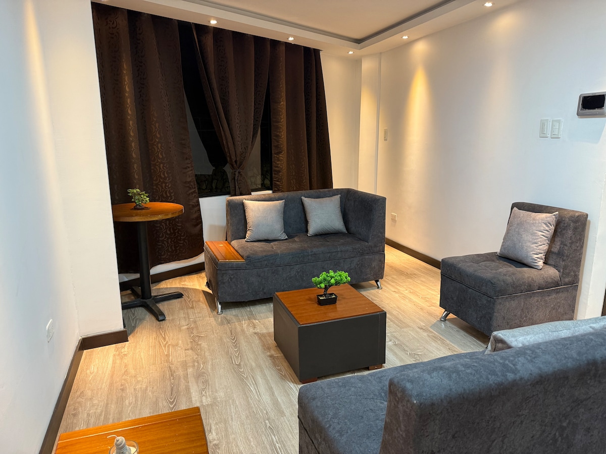 Suite located in the Mariscal area, on the fifth floor of the Monarch building that has a security guard. Due to the location it has a beautiful view of the mountains (see photos).The suite is private, has Wi-Fi, television LG, a king size bed, two sofa beds, a private bathroom with hot water, balcony and fully equipped kitchen. The suite keys will be delivered with a tag for principal entry. Aditional has a internal parking. Welcome to Quito and enjoy your stay in the best area of the capital.