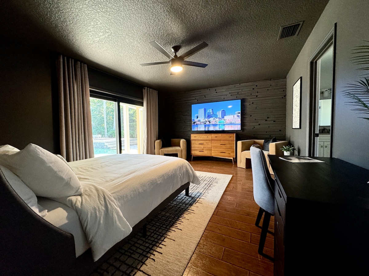 Welcome to your getaway near Universal! Enjoy your independent space with private entrance, designer bathroom, Wi-Fi, Smart TV, and outdoor deck. Perfect for couples or solo travelers. Includes free assigned parking and easy self check-in Just 1.7 mi from Universal Studios! Minutes from all major attractions: Universal Epic World SeaWorld Disney World Outlets & Malls Downtown Orlando & Convention Center 20 min to MCO Airport, 45 min to the beach Quiet, stylish, and ready to unwind.