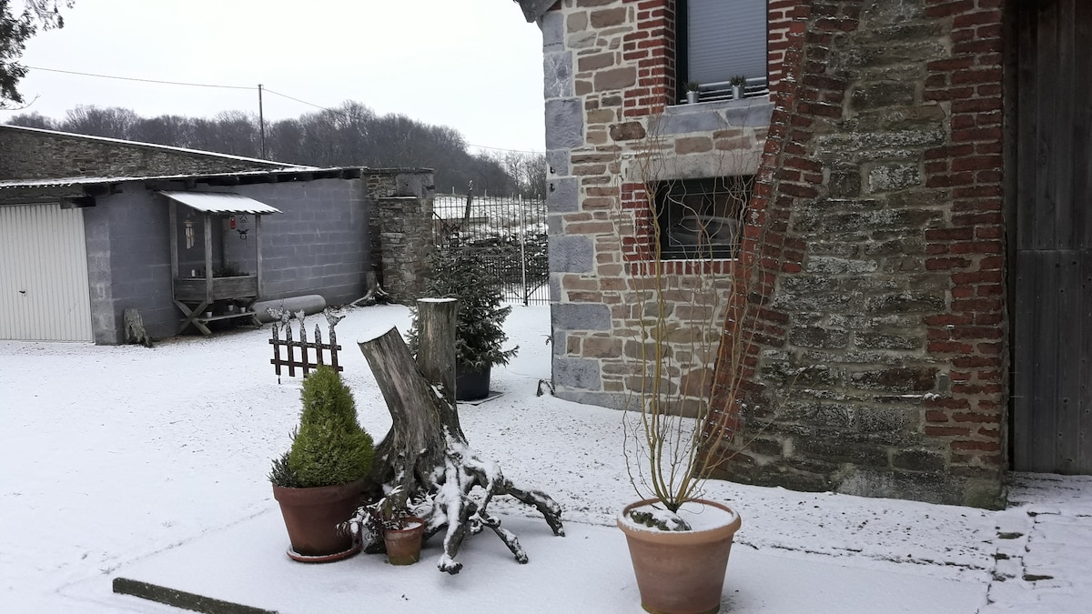 Pleasant, luxury, warm, comfortable cottage, surrounded by nature with a beautiful view of the Ardennes, large private garden with swing, private parking in front of the house. New high speed wifi. Last house at the top of a pretty little village, on a dead end road, 150 m from the forest. Perfect for walks. For 2 adults and possibility of 1 child and 1 baby. 1 hour 15 minutes from Brussels, Liège, Lux. 4km from the Meuse valley. Tennis!! under construction. Spa pool 15' Golf 12'..