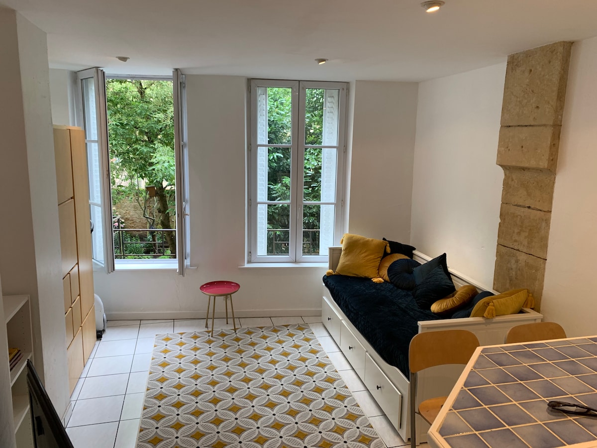 Studio de 30 m2 situé au rez-de-chaussée d’un immeuble, donnant sur une petite cour, à proximité de la Place Saint-Louis à l'entrée du centre-ville. A deux pas des commerces, marchés, restaurants. Entièrement rénové et meublé tout confort, il est composé d’un séjour avec un lit deux places (160x200), d’un coin cuisine équipée et d'une salle d'eau avec wc (et lave-linge). Une mezzanine accueille deux couchages une place.
