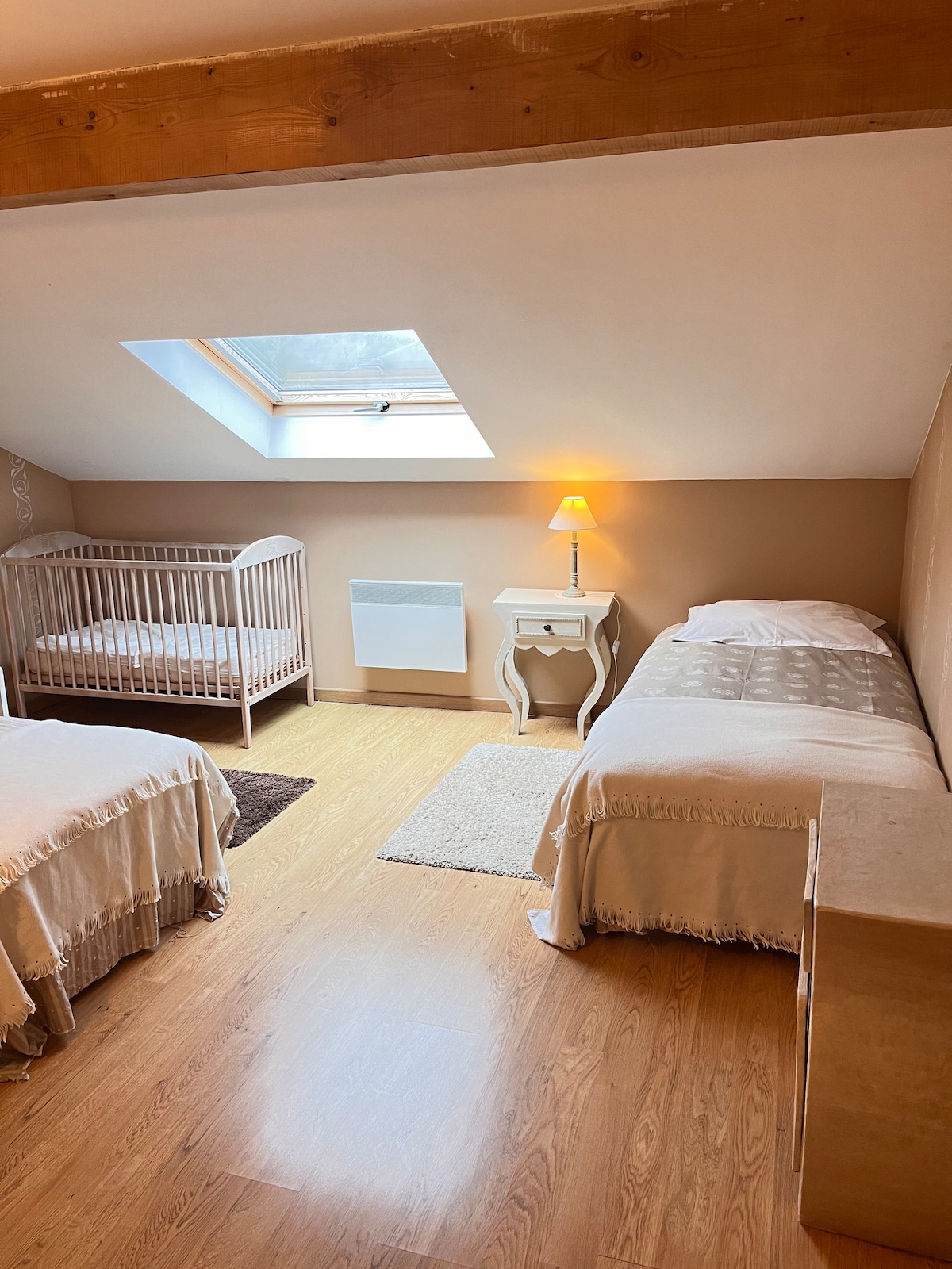 Chambres d'hôtes à l'étage de notre maison d'habitation, sur une exploitation agricole. Entrée indépendante. 2 Pièces sont à votre disposition : - une chambre avec 2 lits 1 pers. une télé, un dressing - une autre pièce avec 1 lit 160x200, une petite salle d eau, un WC indépendant, une télé ainsi qu'un coin repas. Petits déjeuner servis en chambre ou sur la terrasse en été.