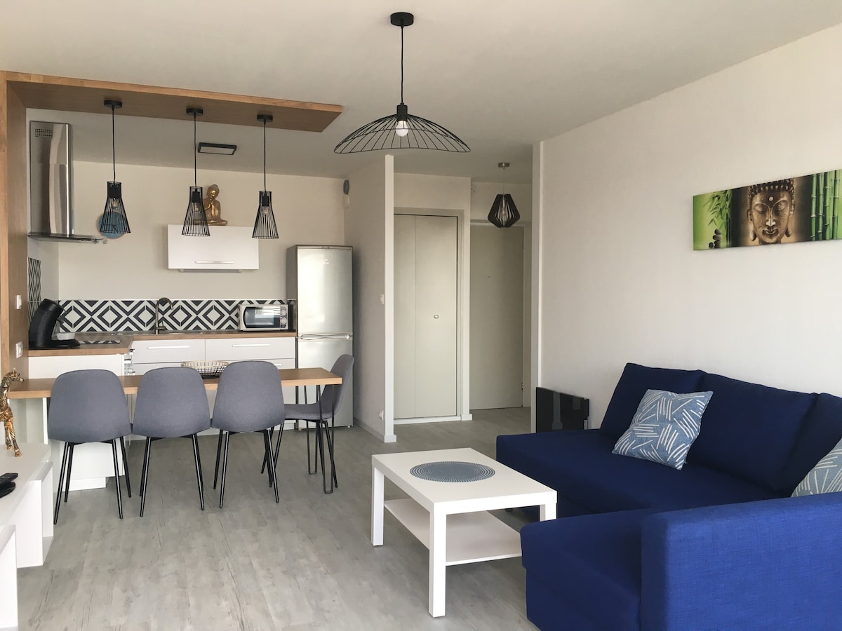 Appartement lumineux et tout équipé dans un quartier calme. Il dispose de 2 chambres et est situé à 15 minutes en transport du centre ville. Un parking gratuit vous permet de vous garer au pied de l'immeuble. Une terrasse avec jardin privatif accessible depuis le séjour vous permettrons de profiter d'un apéritif au soleil Une salle de sport pour vous détendre et une buanderie sont à votre disposition dans l'immeuble. Commerces (Auchan, boulangerie, banque, laposte...) accessible à 200 mètres