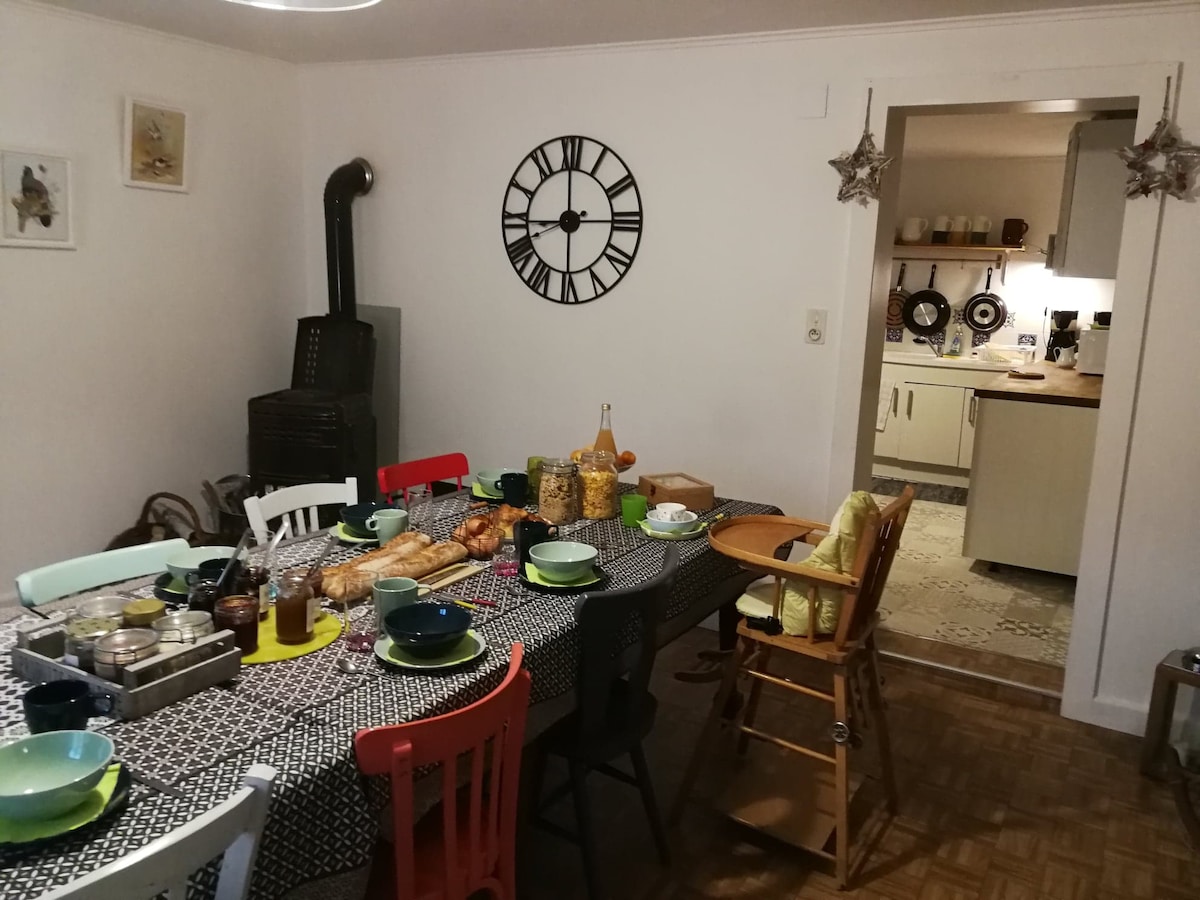 Bienvenue dans notre chambre privée avec vue sur le jardin , au calme , en campagne avec toutes les commodités du village à votre portée . Veuillez noter que l'heure d'arrivée maximum est 22h . La salle de bain sera partagée avec notre fils adulte ou un autre hôte. Les draps et serviettes de toilettes sont fournis . Possibilité de prendre le petit déjeuner pour 7 € en sus et par personne . Merci de le preciser quelques jours avant . Boissons offertes( thé, infusons ou café )