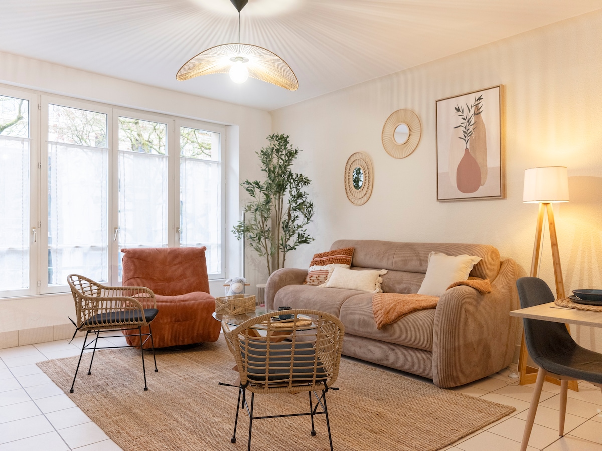 Bienvenue dans ce cocon élégant et chaleureux idéalement situé à deux pas du centre et certains sites touristiques à pieds. Profitez de la cuisine entièrement équipée, d'une chambre spacieuse, de la fibre, d'un espace bureau, d'une douche italienne raffinée et d'une cheminée électrique pour vos moments de détente chaleureux. Le tout, fraichement décoré par une décoratrice d'intérieur. Offrez-vous une parenthèse de confort et de style : réservez dès maintenant pour un séjour mémorable !