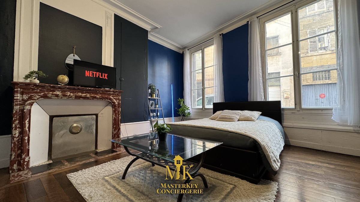 Dans un immeuble de caractère, ce studio mêle charme ancien et confort pratique : cheminée en marbre, hauts plafonds, murs bleu profond… un cadre cosy et raffiné, idéal pour une escapade romantique ou un déplacement professionnel. 🛋️ Canapé-lit confortable 🧺 Linge de lit et serviettes inclus 🚶♂️ À 5 min à pied du boulevard de la Rochelle 🔑 Accès autonome via boîte à clés sécurisée Tout est pensé pour un séjour agréable, calme et pratique, dans un environnement chaleureux.