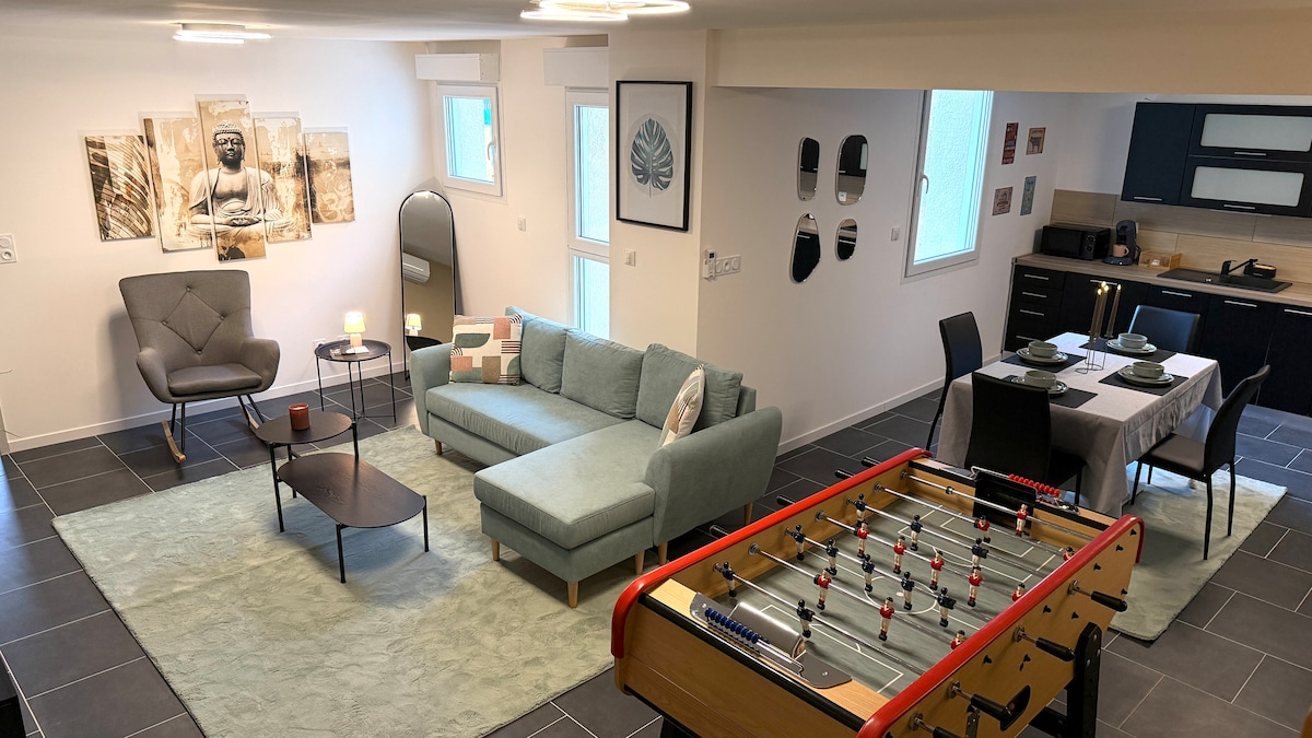 ✨ L’Élégante Escapade – Grand Loft 120 m² avec terrasse privée, proche du Lac du Der. Séjournez à Wassy, dans un loft spacieux et moderne pouvant accueillir jusqu’à 8 personnes. Profitez d’un emplacement idéal : 🚤 à 20 min du Lac du Der et ses activités nautiques, 🎢 à 45 min de Nigloland, 🍇 sur la route du Champagne et des églises à pans de bois, 📍à seulement 2h30 de Paris, 1h30 de Reims et 1h10 de Troyes. C’est le lieu parfait pour un séjour en famille, entre amis ou pour le travail.