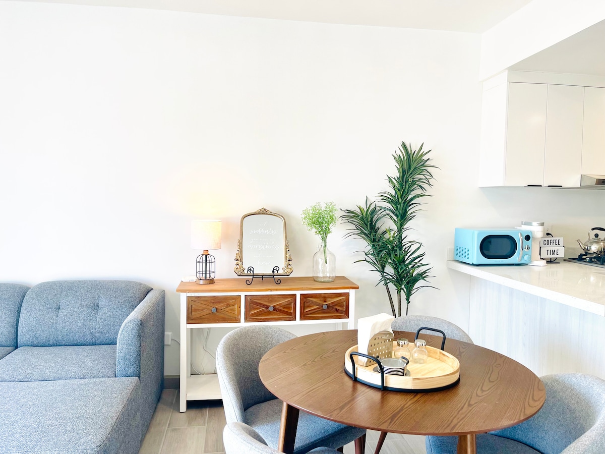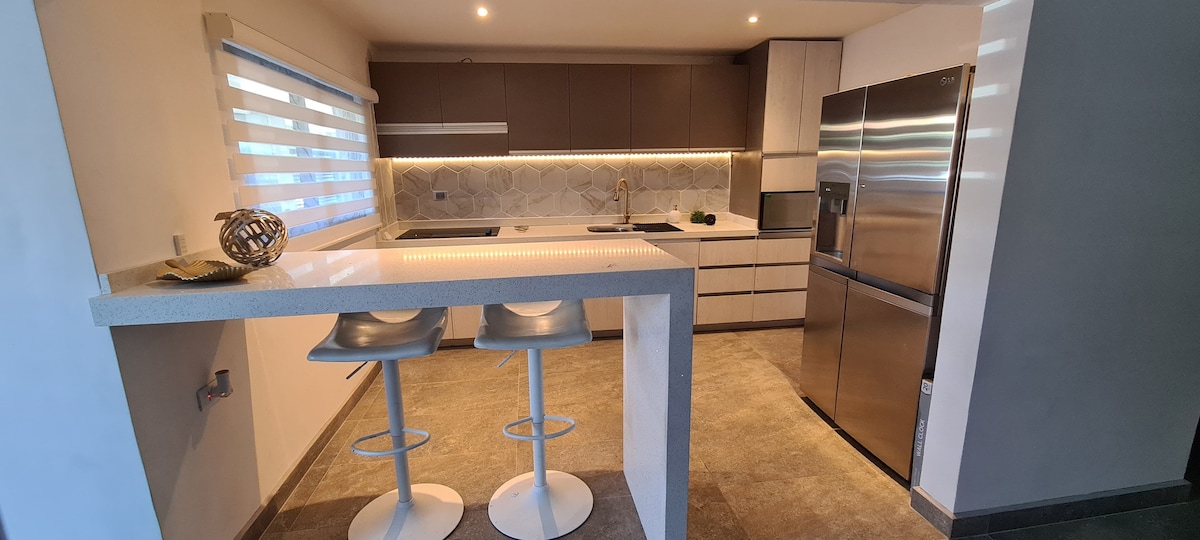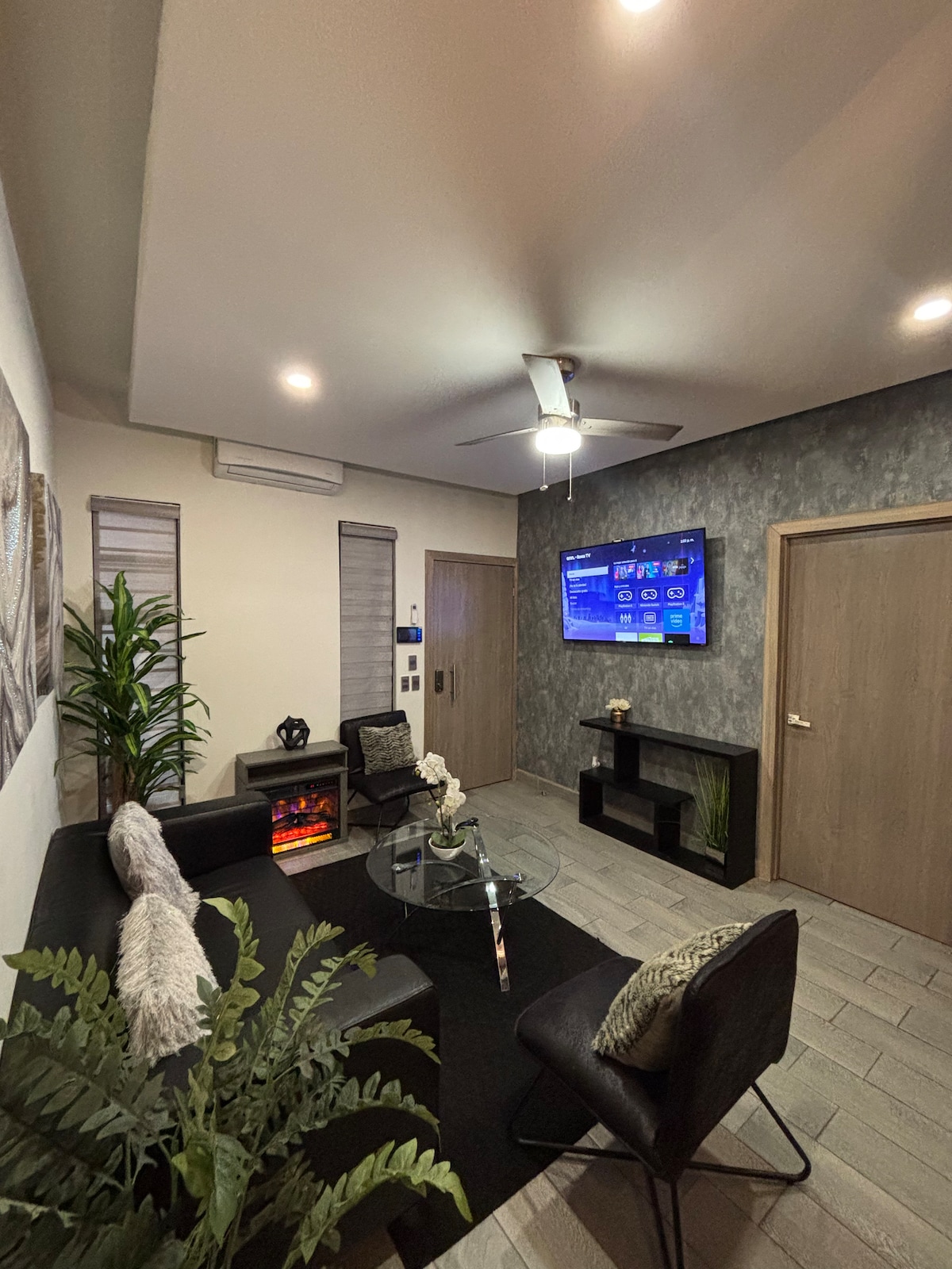 - Modern 2-bedroom apartment on the 5th floor, minutes from Plaza Cachanilla - Elevator access for easy convenience - Self check-in with smart keypad - Parking for 2 vehicles - AC throughout the apartment - Fully equipped kitchen, dining area, and laundry space - 75” 4K Smart TV with Netflix, Disney+, Amazon Prime, and HBO - Communal terrace on the 9th floor with business center, grills, and lounge area - Social Club access: swimming pool, gym, and game room - We issue MX invoices (Facturamos)