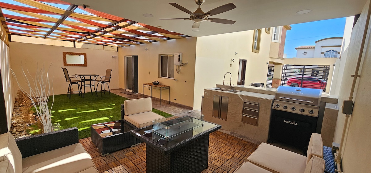 Enjoy a spacious and modern 3-bedroom home in Nuevo Mexicali's exclusive Alcázar 2. Relax with a 85-inch 4K TV, 300 Mbps WiFi, and a fully equipped kitchen. Unwind in the shaded patio with a BBQ island and six-burner grill. Just 10 minutes from the Calexico East border and 3 minutes from shopping, dining, and main streets, this home is perfect for business or leisure. Book now for a comfortable and stylish stay!