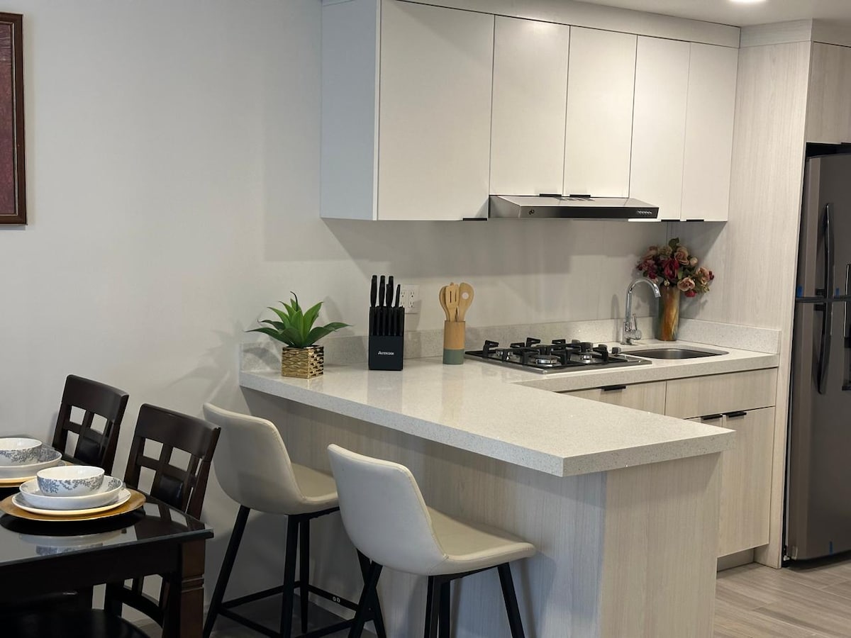 - Modern 2-bedroom apartment on the 5th floor, minutes from Plaza Cachanilla - Elevator access for easy convenience - Self check-in with smart keypad - Parking for 2 vehicles - AC throughout the apartment - Fully equipped kitchen, dining area, and laundry space - 75” 4K Smart TV with Netflix, Disney+, Amazon Prime, and HBO - Communal terrace on the 9th floor with business center, grills, and lounge area - Social Club access: swimming pool, gym, and game room - We issue MX invoices (Facturamos)