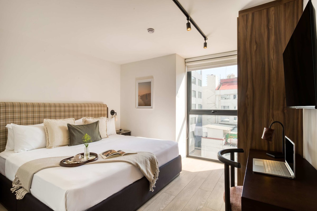 Modern studio in Roma Norte, steps from CDMX’s best restaurants, cafés, art galleries, and nightlife. Walk to Mercado Roma, Parque España, and Av. Álvaro Obregón. Enjoy premium amenities: a full gym, a coworking-ready business center, a game room, and a terrace with panoramic views of Paseo de la Reforma. Perfect for remote work, city exploration, or relaxing in one of Mexico City's most dynamic neighborhoods.