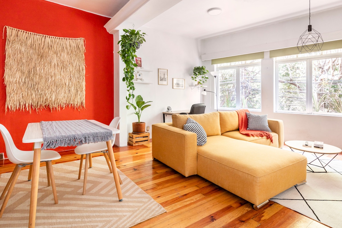 We are inside of a just renovated building from the 50s located in the heart of hip neighborhood "LA CONDESA" Walking distance from Parque México, and lots of coffees and shops. Sevi and Martina will be happy to show you the neighborhood and be your hosts. This apartment is all newlly fresh decorated all hand made by us, super cozy, with lovely living room with fresh vibes, kitchen and super nice king size spacious bedroom.