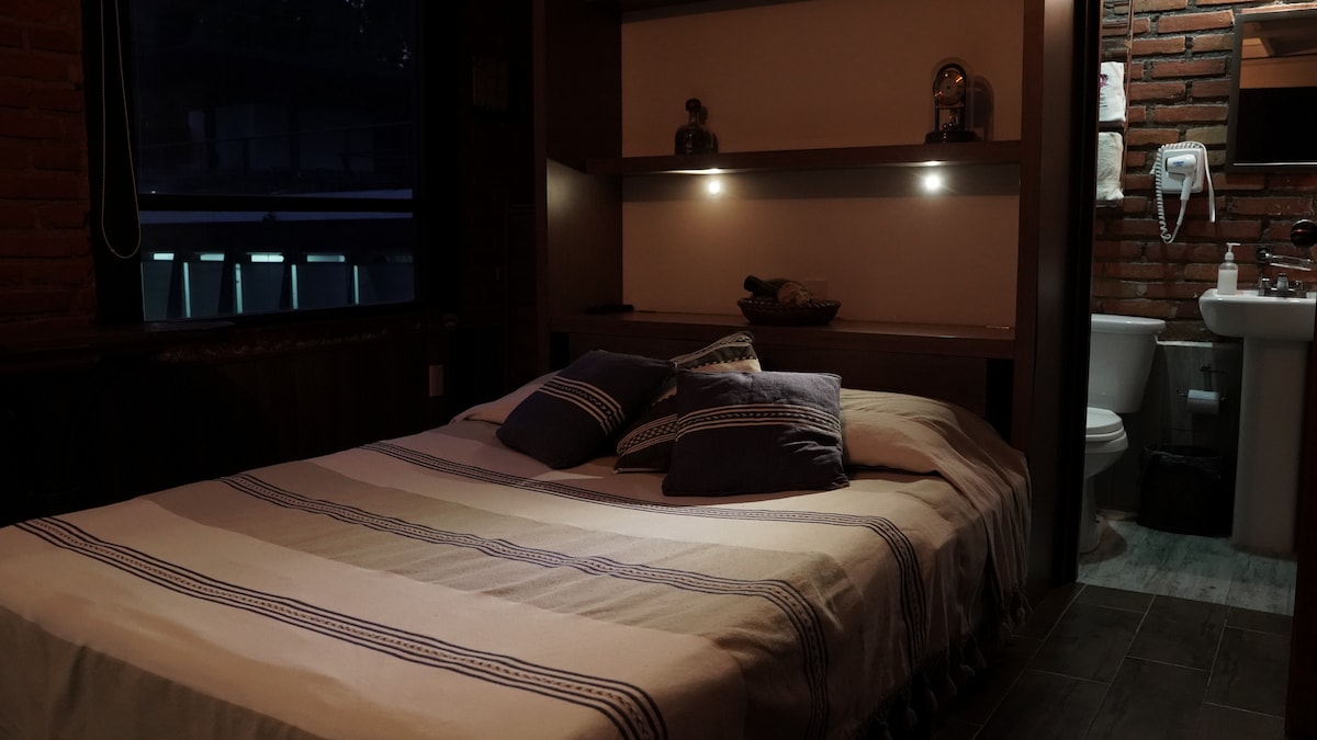 Luminosa habitación avant-garde, con baño privado, en El nuevo barrio de moda: Santa María la Ribera. Viva una experiencia entre la tradición y la vanguardia, en una céntrica zona llena de color y vida. A 10 minutos de la estación Metro, y a 3 estaciones de Bellas Artes. La habitación es de muros altos y con un gran ventanal a un típico patio mexicano lleno de murales e historia. La casa ha sido catalogada en el más alto grado, por su gran valor artístico. La habitación es muy silenciosa.