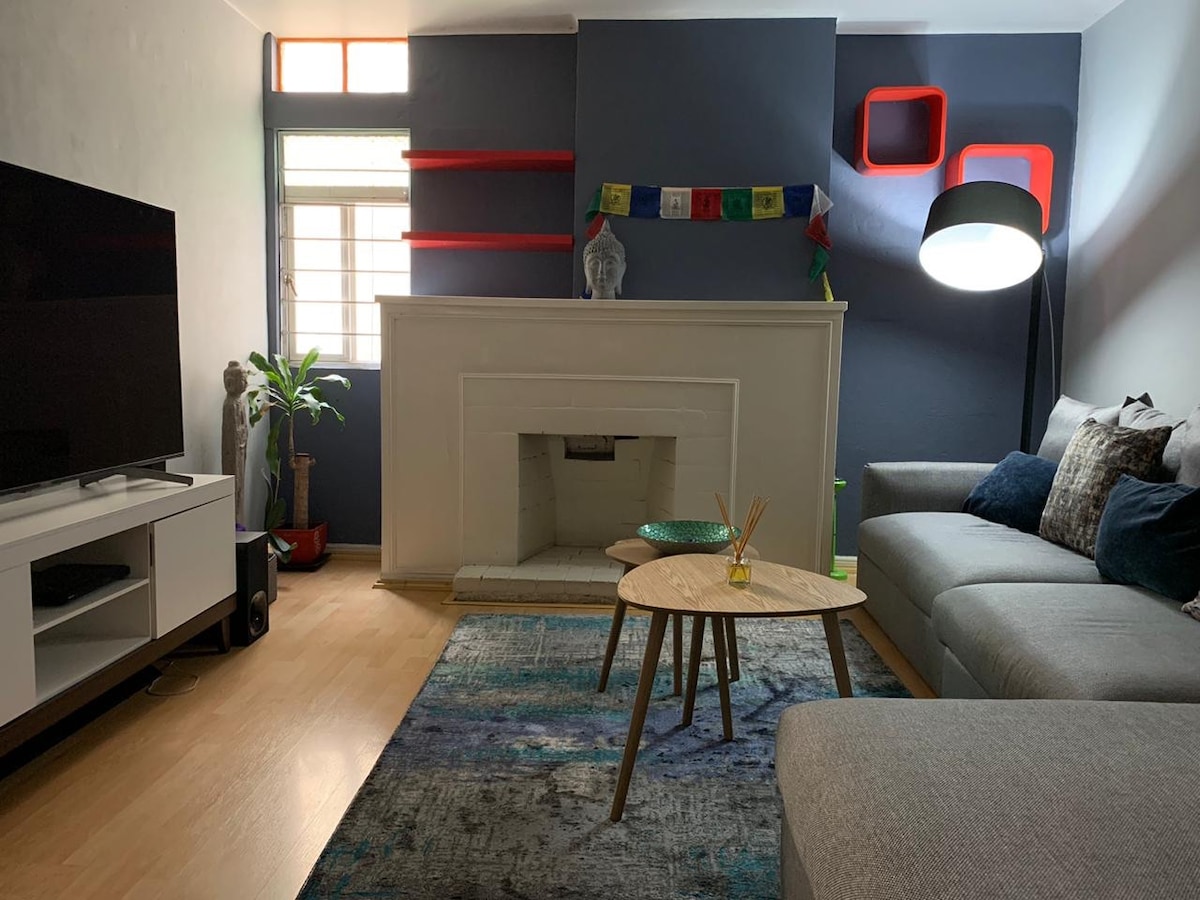 "Mexican traditions", located in a Porfirian building in Roma Norte, decorated with references to Mexican traditions. It has: spacious and equipped bathroom; washing machine strategically located; kitchen equipped with grill, microwave, and refrigerator; dining room with table and chairs for four people; living room with sofa and chairs to relax. Master bedroom with king-size bed, closet, TV and air conditioning. Access to the garden from the living room and bedroom. Ideal for extended stays.