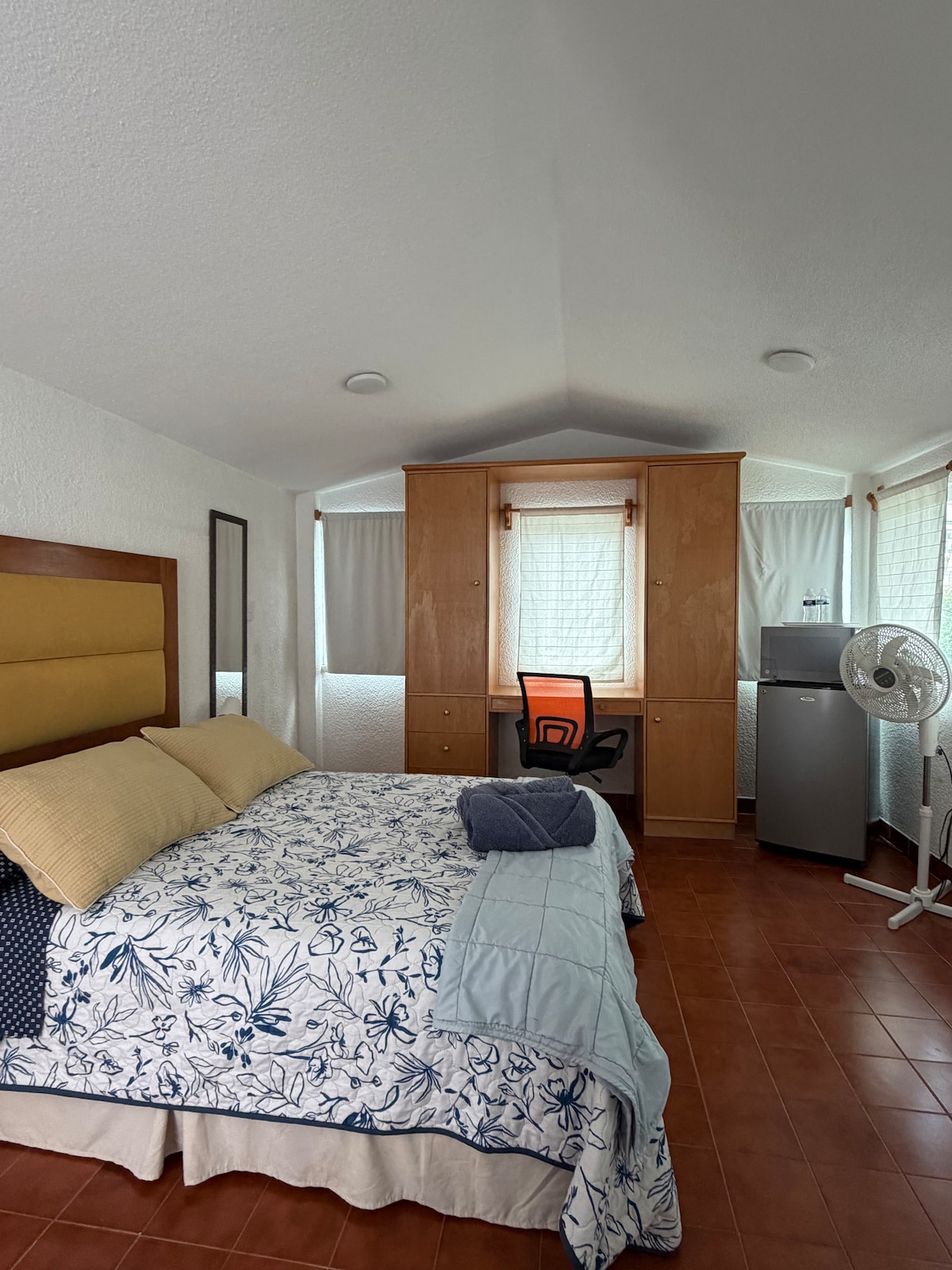 ¡Este lugar tiene una ubicación estratégica! Cuenta con: - Cama matrimonial. - Mueble de cocina con parrilla eléctrica de 2 quemadores y tarja. - Frigobar "Teka". - Horno de microondas. - Mesa con silla. - Escritorio con silla de ruedas. - Futón matrimonial (2 asientos) para ver la TV. - TV "TCL" SmartTV 4K de 43 pulgadas. - Mueble para guardar ropa. - Baño completo (WC, lavamanos y regadera). - Boiler eléctrico. - Cisterna y tinaco propio.