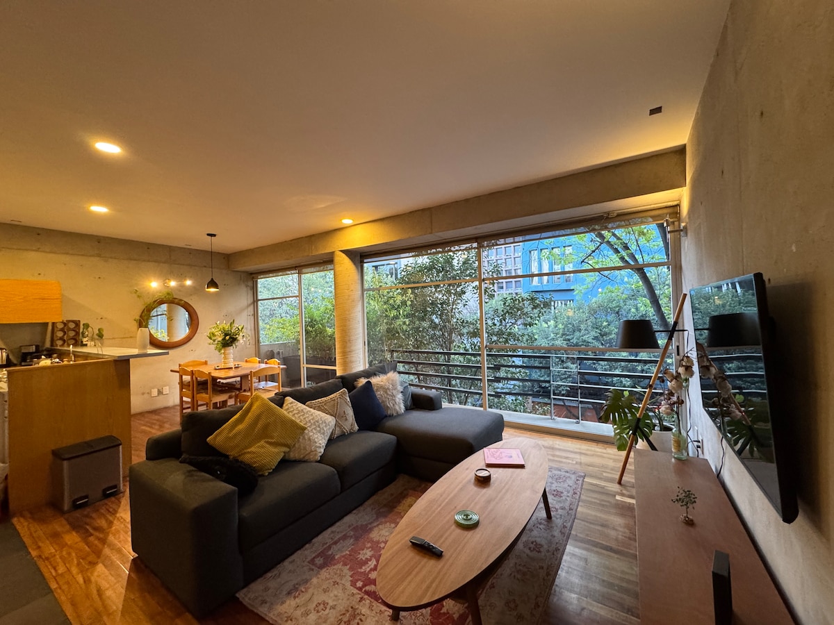 "Mexican traditions", located in a Porfirian building in Roma Norte, decorated with references to Mexican traditions. It has: spacious and equipped bathroom; washing machine strategically located; kitchen equipped with grill, microwave, and refrigerator; dining room with table and chairs for four people; living room with sofa and chairs to relax. Master bedroom with king-size bed, closet, TV and air conditioning. Access to the garden from the living room and bedroom. Ideal for extended stays.