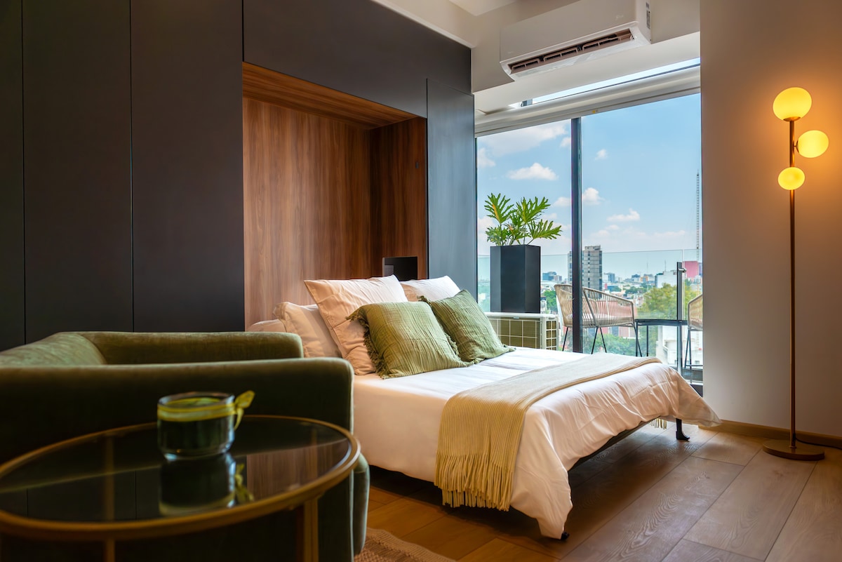 Disfruta de una experiencia con estilo y buen gusto en este alojamiento. Diseñado especialmente para disfrutar y relajarse. Es un espacio ideal para parejas o viaje de trabajo. Cuenta con un balcón con excelente vista panorámica, con suerte te puede tocar apreciar excelentes atardeceres. Contamos con persianas black out para regular la entrada de luz. Un amplio baño y vestidor para consentirte con una ducha. Y te aseguramos siempre tener café y té para esos momentos de paz.