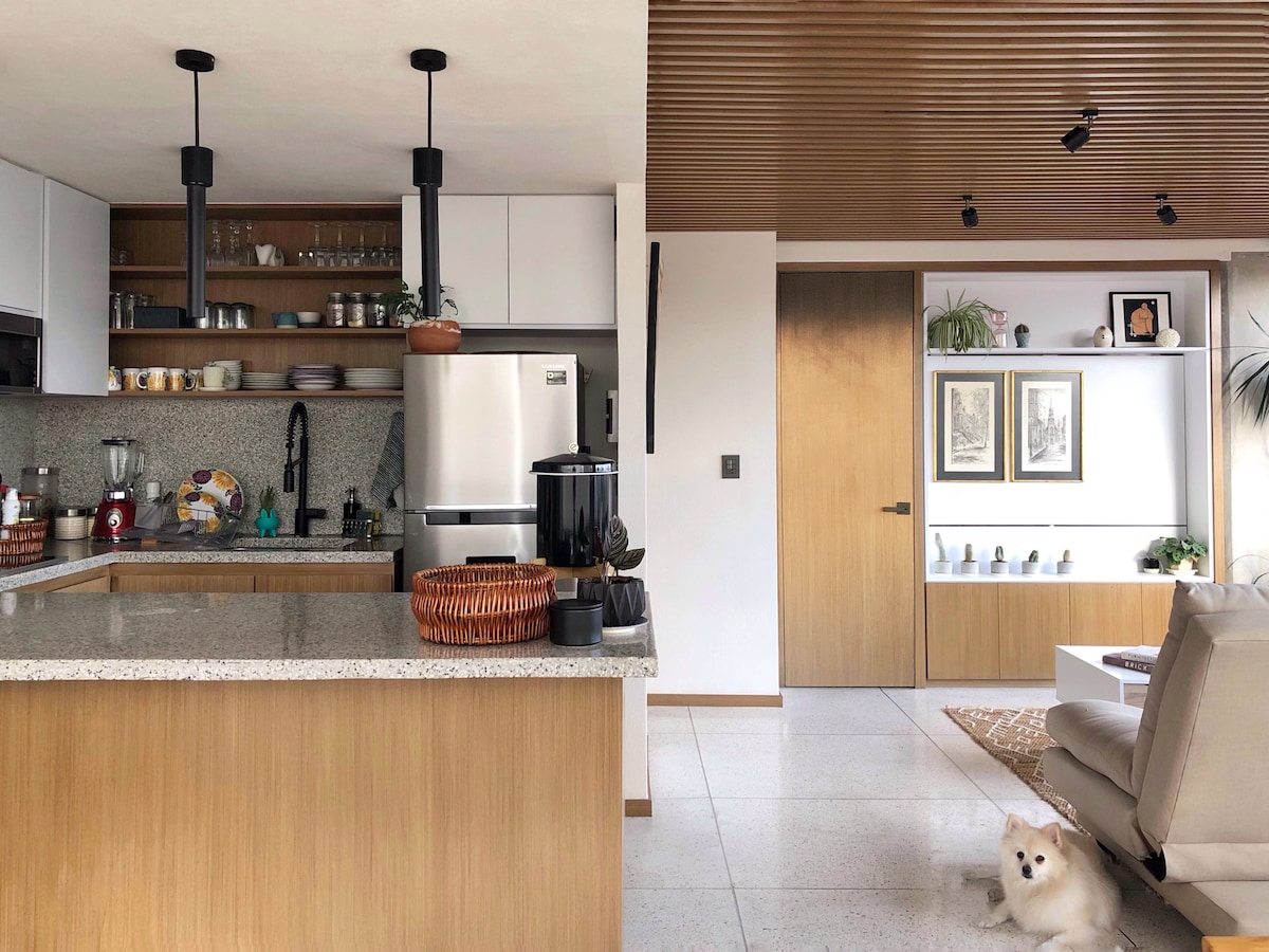 With an unbeatable location in the heart of the Roma Norte neighborhood, is steps away from great cafes, restaurants and galleries. Thoughtfully newly decorated by a recognized European interior designer based in Mexico, the apartment is full of magical touches -art. The dining area will make you live an unforgettable experience. In the terrace you can relax and dine al fresco in complete peace and privacy. Unique apartment! King bedroom on the second floor, loft-style with a semi-open layout.