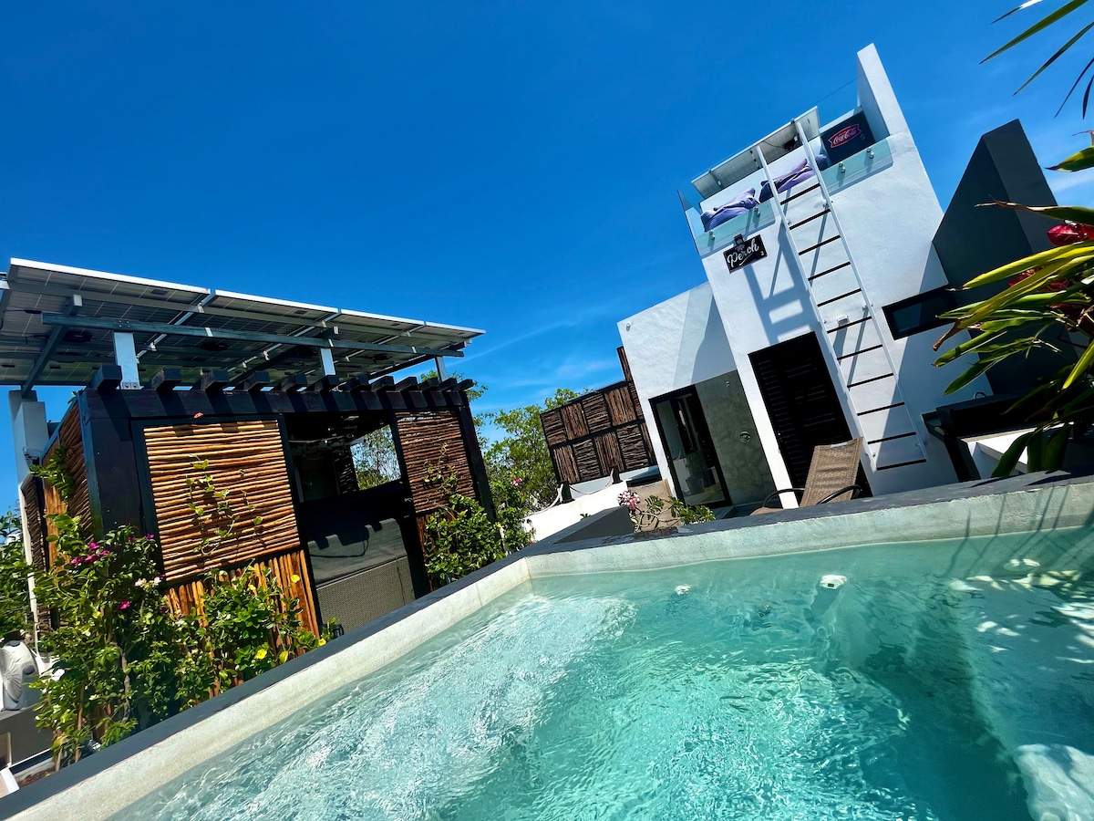 Escape to Casa Izar! An exclusive luxury villa in Tulum with 3 bedrooms, surrounded by jungle and just minutes from the beach. Enjoy a private , healthy Salt based treatment and heated pool, jacuzzi, fire pit, outdoor shower, 4 hammocks, BBQ, and a spectacular garden. Total privacy, elegant design, and a premium experience in the Mexican Caribbean. Casa Izar combines the best of modern luxury with the natural essence of Tulum.