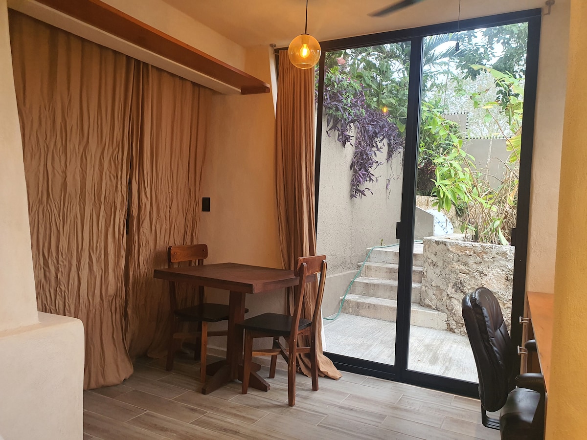 Reconnect with nature at this unforgettable spot on the edge of Laguna Bacalar's Cenote Negro. The studio, also called "The Burrow", is close to the water's edge, complete with a A/C, king sized bed, kitchen with small fridge, 2 burner stove and toaster oven, reverse osmosis water filter, large desk with high speed internet, and shared use of the dock (and kayaks/SUP). Perfect for a relaxing holiday and/or a work from paradise destination!