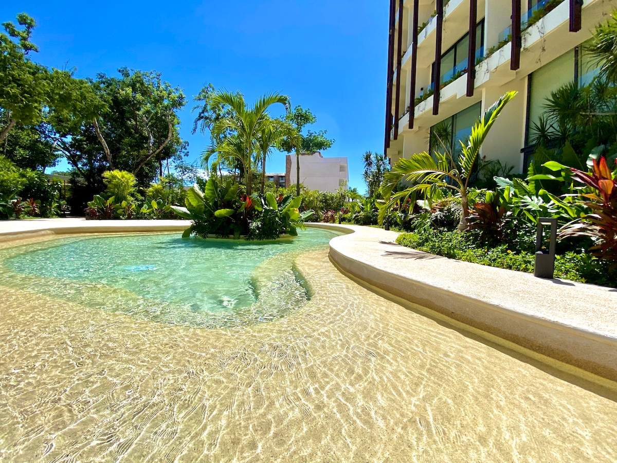 Sparkling studio apartment, near Tulum center (restaurants, shops) and only a few minutes from the spectacular beach and Tulum beach clubs. Enjoy several stunning swimming pools, a roof top pool, sun beds, fitness center, 24/7 staff, strong A/C, elevator, fast Wifi (100 Mbps), blackout curtains, 50" smart TV and a fully equipped kitchen. Experience outdoor dining or just drinks with beautiful panoramic views at the roof top restaurant and bar.