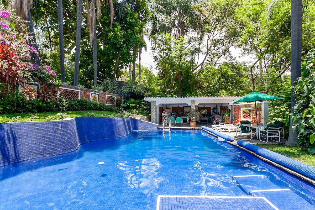 Best Location in Popular La Veleta! Right near trendy Calle 7 Sur. Walk to amazing restaurants, cafés and shops. Great for wedding parties! Totally private and safe villa with gorgeous palms and jungle landscaped gardens. A stunning pool with a fountain to relax by. This villa has unique architecture with designer decor that showcases original local artwork. It is exclusive to one booking. Designed as 2 separate condos, an upper and lower, with a total of 4 bedrooms with private ensuite baths.