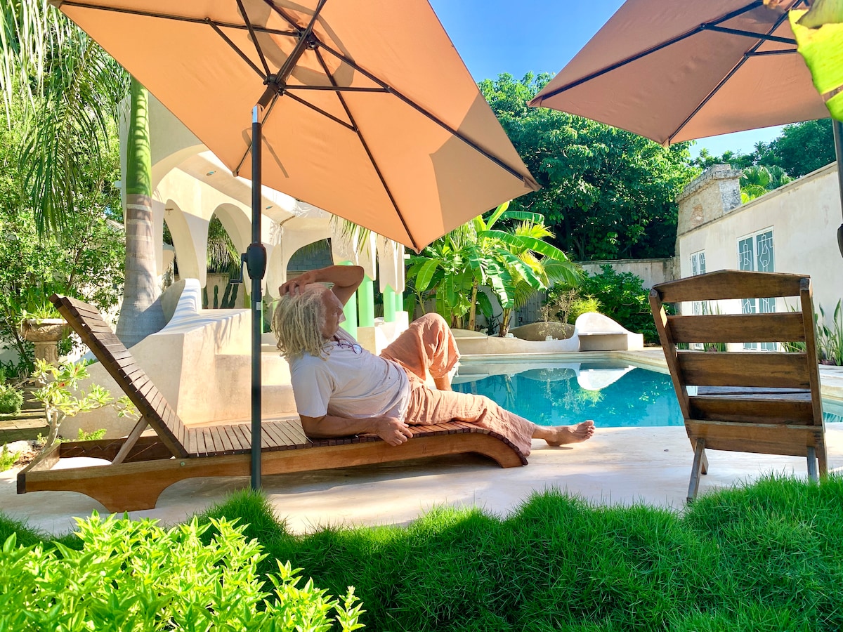 Casita Nube’s dome ceiling and whimsical design create a serene, womb-like enviroment with views of the garden. Inspired by a traditional Mayan hut, its doors align with a graceful fig tree that grows along the wall like living art. Inside, a queen bed, private bath, and cozy workspace flow with the dome’s soft curves. Behind the casita, a private patio with an outdoor kitchen invites morning light and evening breezes.