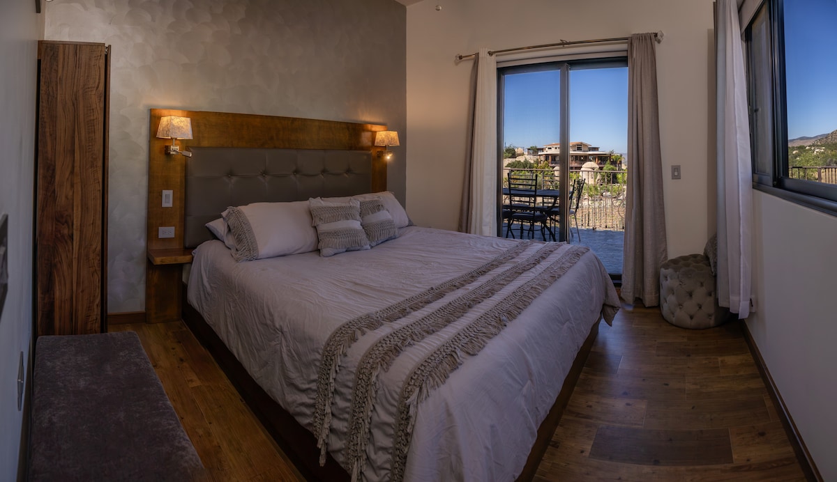 Vive la esencia del Valle en Luna del Valle, refugio entre viñedos con alberca y vista panorámica. Suite de 2 recámaras con camas King, cocina y terraza privada con vista al viñedo. En Hacienda y Cava Martlot disfruta nuestra uva Barbera y Nebbiolo. Incluye cata de bienvenida y tour por nuestras 2 cavas. Servicios: Chef privado, masajes y decoración para eventos (bajo solicitud). Ubicados en la Ruta del Vino, a 30 min de Ensenada centro. Ideal para amantes del vino y el relax.