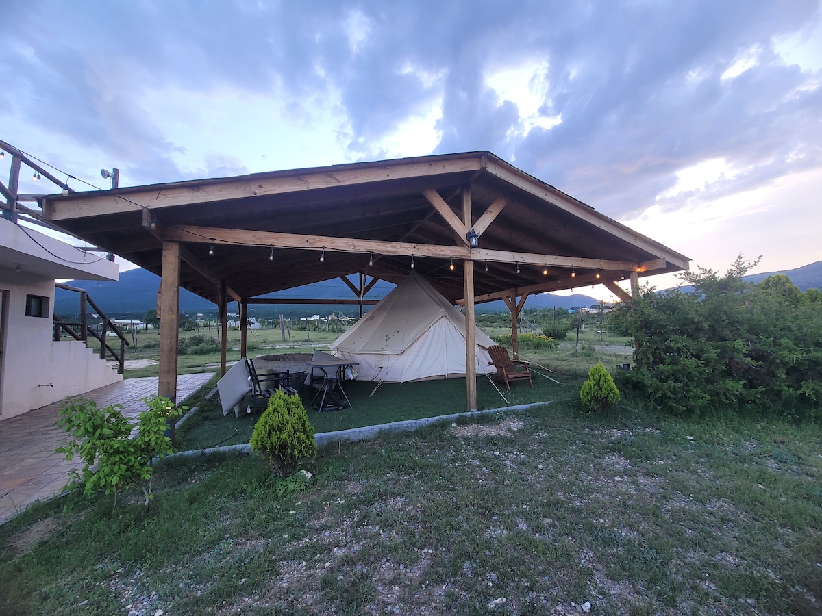 Este es un tipo de alojamiento diferente, es aventurarse en el campo, en un espacio abierto donde admirarás el bello paisaje de las montañas frente a ti , es glamping, te hospedaras en una casa de campaña especial que cuenta con una cama matrimonial, también cuenta con un comedor para 2 personas tu alojamiento está frente a una hermosa sierra con vista a un hermoso cañón, tienes acceso a baño exterior y puedes practicar senderismo.