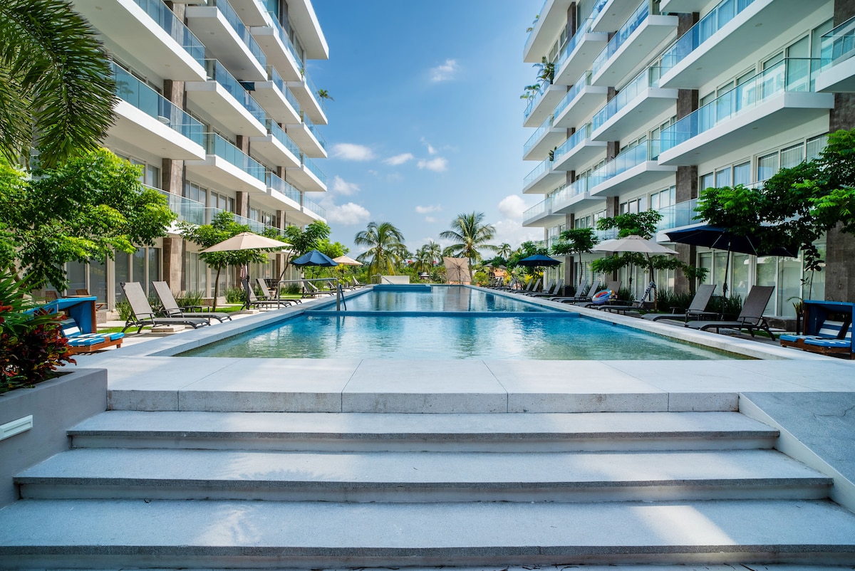 Condominium on the 12th floor. Expansive view of the ocean and river walk. Gorgeous amenities include 5 pools including, 5 hot tubs, tennis courts, gym, spa, onsite restaurant and room service. 24/7 security & safe. Spacious balcony from living room and bedroom overlooks the ocean. Includes covered parking, electricity, air conditioning, hi speed wifi, 2 large smart TV's, housekeeping every 2 weeks. Close for walking to grocery, restaurants, clubs, trail. Courtesy pick up from airport.
