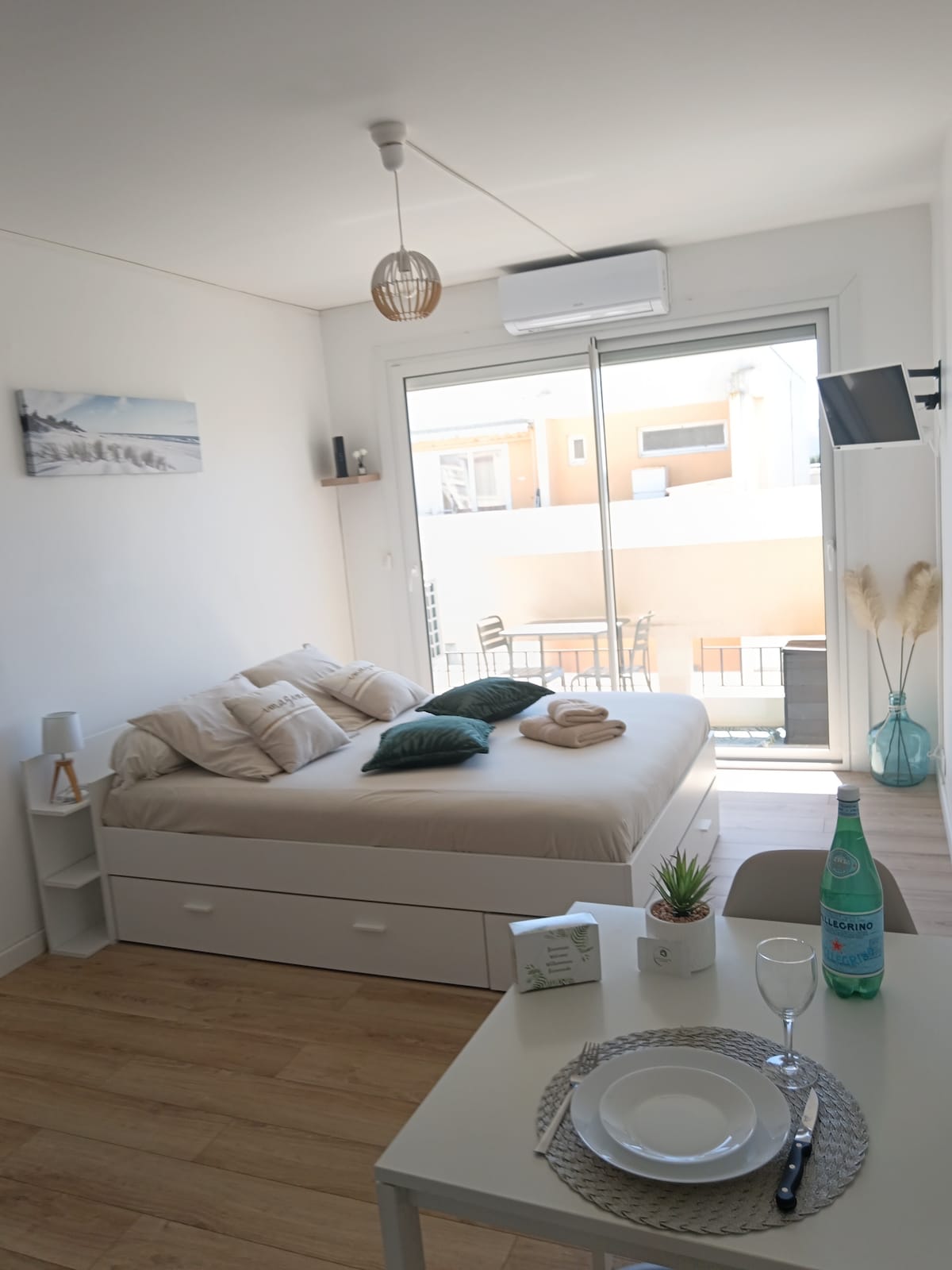 Joli studio lumineux rénové à neuf en rez de jardin dans une villa individuelle, très proche du centre ville et des commodités et de l'étang de Thau. Coin cuisine équipée avec réfrigérateur/congélateur, plaques électriques, combiné micro-ondes/four, machine à café filtre, table et chaises. Penderie. Lit 140x190 Salle d'eau, douche, lavabo, wc TV Climatisation, wifi Parking privé dans l'allée. L'appartement est non fumeur et les animaux ne sont pas admis.