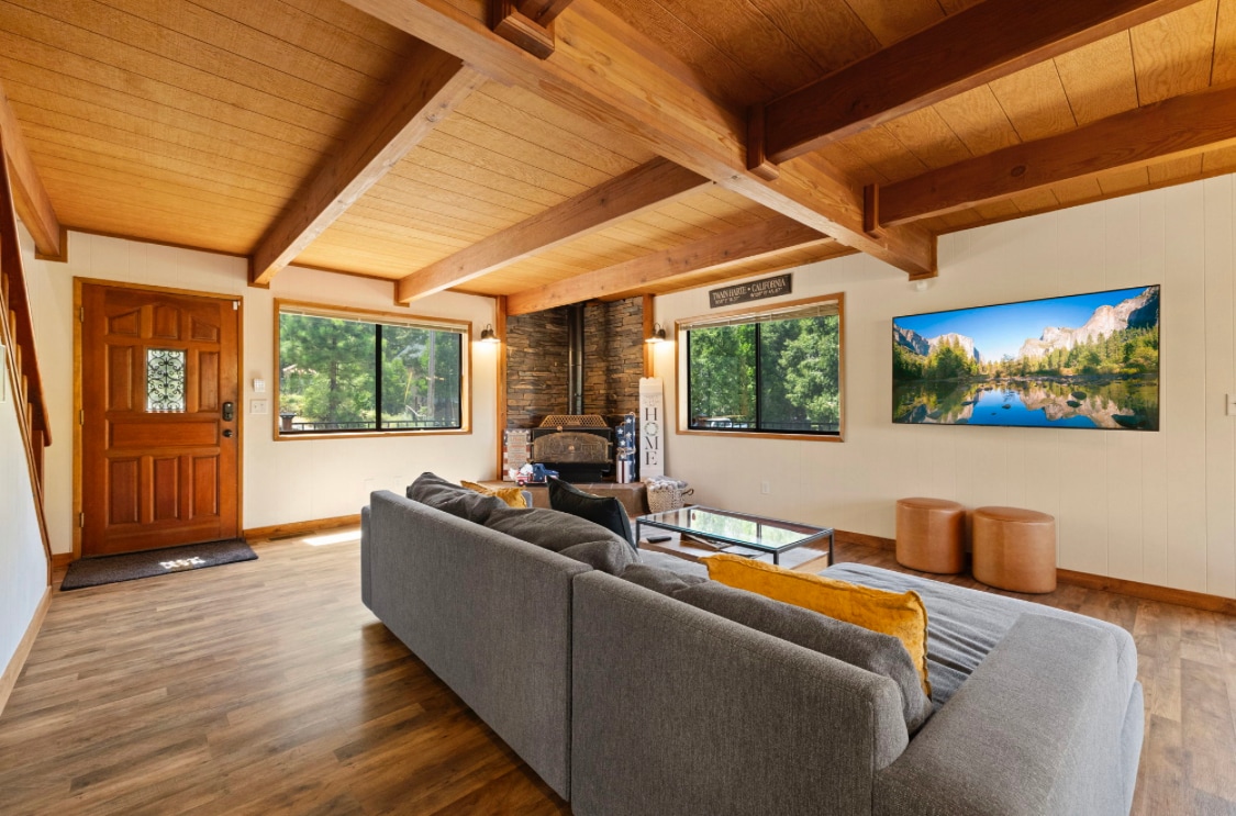 Enjoy an escape to crisp, clean mountain air and a relaxed lifestyle: Mountain Time. Curl up in front of the warm and welcoming fireplace, enjoy cocktails on the large deck, and take advantage of never ending outdoor activities. This three-bedroom, two bath mountain sanctuary is located just above the Stanislaus River in the Sierra Nevada Mountains. Elevation 5,000 feet. The cabin is a short walk from the Old Strawberry bridge and several forest trails.