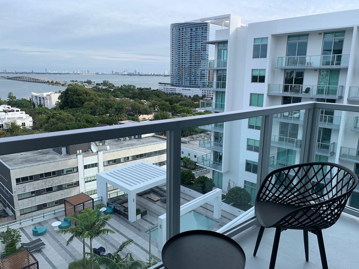 Penthouse Level Studio with DIRECT WATER VIEWS in Miami Design District, a room with a view, decorated with lots of love and inspired by the ocean. Residence has 12'' floor to ceiling windows and access to the resort style amenities, stunning pool with cabanas, gym (open 24 hrs.), modern lounge, BBQ area, electric car charging station and FREE ASSIGNED PARKING in the very heart of Miami. Maximum 3 guests. Walking distance to the best shopping, dining, museums and much more.