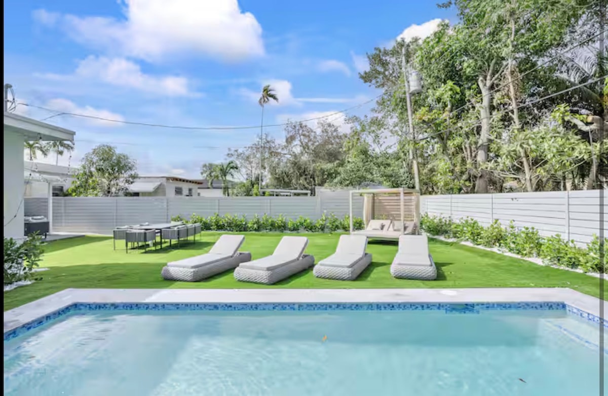 This amazing mini resort has been created with the ultimate comfort of our guests in mind. Enjoy a courtyard and pool deck designed with plenty of outdoor seating and a tiki hut. The property has synthetic grass through out, perfect for kids and family to sit and play on. Super fast Wifi. USB ports in the bedroom. Super comfortable bed. Smart Tv that you can Stream your favorite movies to. Washer/Dryer combo. Outdoor BBQ. Our home is located Minutes from downtown and Hollywood beach/ boardwalk.