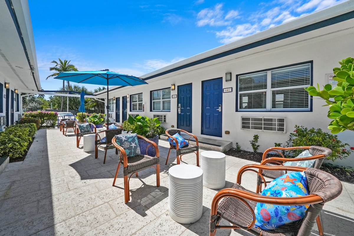 The king room is our smaller economical option at 220 sq. ft. It's made for travelers to save money and doesn't face the ocean. We also have 450 sq. ft. studios & oceanfront suites for just a bit more. We're a small historic boutique hotel in Fort Lauderdale Beach, 60 ft from the ocean. We have a rooftop terrace and 2nd fl terrace. We have free beach gear, free WiFi, and $10+tx/day parking for a small or midsize car. The main guest MUST be 25+ so families don't have to worry about parties.