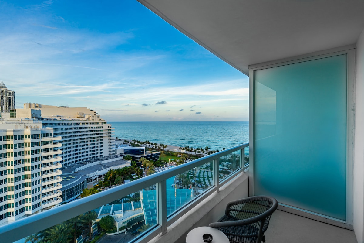 Luxurious 1,070 sq. ft. Ocean-View suite at the Fontainebleau Hotel, located in the Tresor Tower. This stunning 1-bedroom apartment features a full kitchen, spacious living room, 2 large balconies, and 2 full bathrooms, including a jacuzzi in the master. Enjoy full access to ALL hotel amenities with No Resort Fee, plus 2 Complimentary Spa Passes! to the Lapis Spa. Sleeps up to 6 with a king bed, queen sleeper, and optional rollaway beds available for $60/night. Perfect for a relaxing getaway!