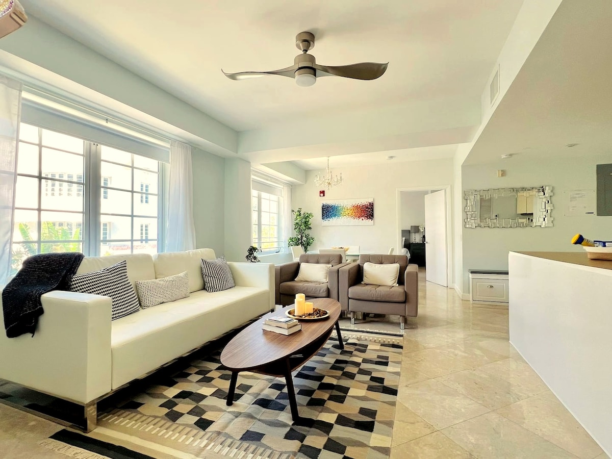 Book with the Benichay Brothers! Green suite 2 bedroom 2 bathroom apartment with 1000sqft ( 100m2 ) In the heart of South Beach and walking distance to Lincoln Rd Mall. Resort day passes are available for an additional charge, you can enjoy pool or beach access with a lounge chair & umbrella, at a nearby hotel guest. We worked out a 20% discount for all passes. 1XQueen Bed 2XFull Bed Sleeps 6