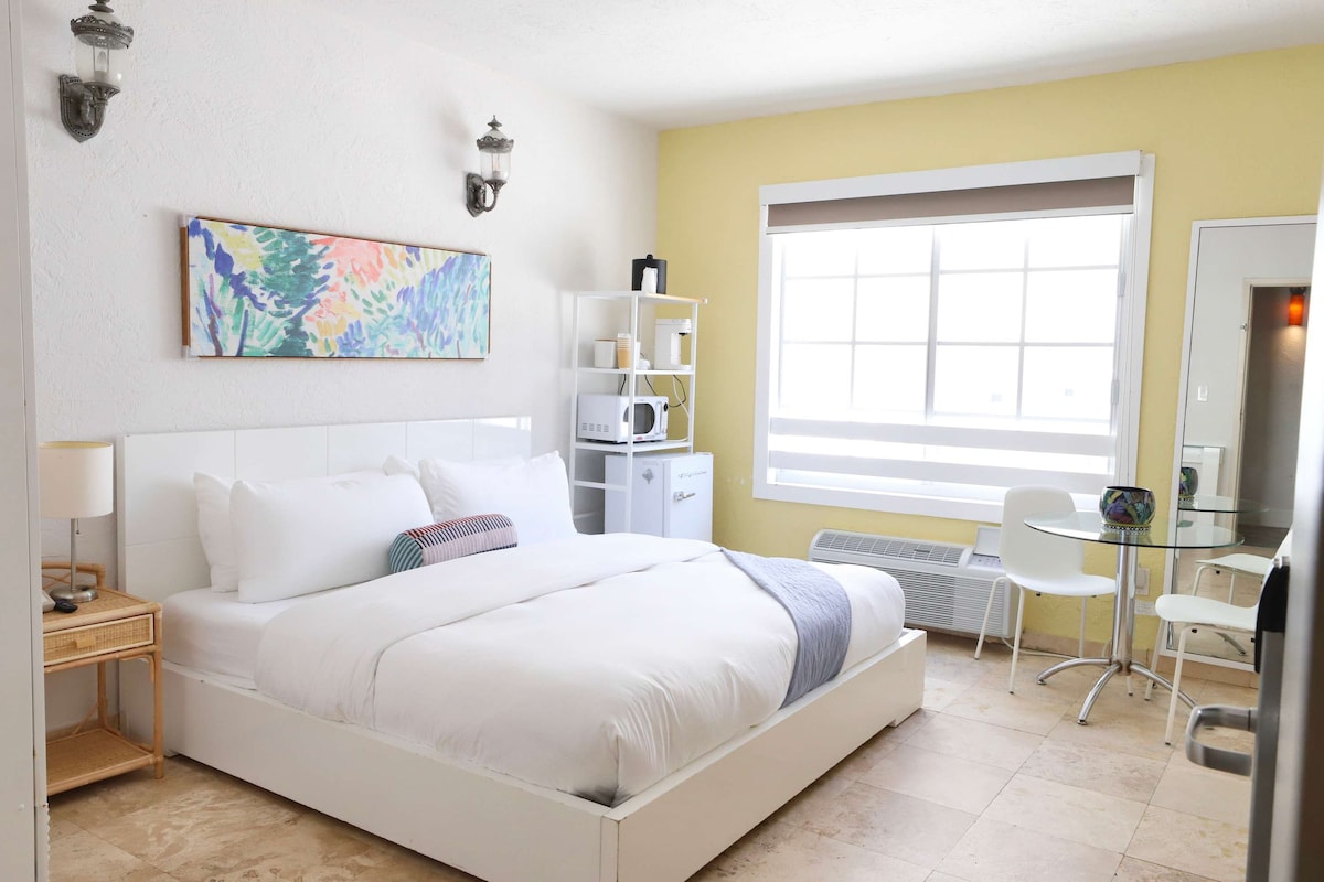 Stay in a bright & spacious Art Deco suite in South Beach’s prestigious South of Fifth neighborhood, just steps to the ocean. This quiet section of Ocean Drive offers a serene escape near playgrounds, dog parks & outdoor gyms. Explore renowned dining, from casual local spots to Michelin-starred restaurants & enjoy vibrant nightlife within walking distance. This luminous corner unit features a king bed, dining nook by the window, DirecTV & all the essentials for your perfect Miami Beach retreat.