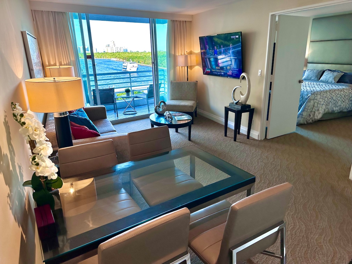5 Star Apart Suites by Hilton, in Fort Lauderdale, is a perfect location for your next beach vacation in South Florida. Our accommodation offers an excellent balcony overlooking the Inter-coastal and the bridge opening up by the best Yachts. Short distance from the Fort Lauderdale beach, the shopping Gallery Mall, the Fort Lauderdale water taxi stop at the Apart Hotel, the pool in front of the complimentary water, Jacuzzi and gym. Our Suite. Deluxe Suite has 1 King bed, 75' Smart TV 4K.