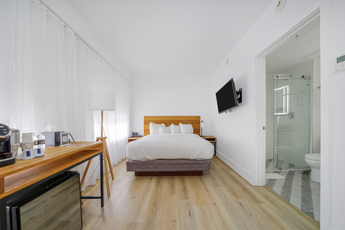 Stay in South of Fifth, Miami Beach’s most charming neighborhood just one block from the beach! This cozy unit features a king-size bed, Smart TV, Wi-Fi, AC, workspace, fridge, iron, hair dryer, & premium linens. Enjoy room service, coffee in the lobby, luggage dropoff, crib on request, & outdoor dining. Perfect for relaxing after a day in the sun. Walk to top restaurants, parks, & the ocean in minutes. On request parking is provided two blocks away from the hotel at a gated garage for $20/day.