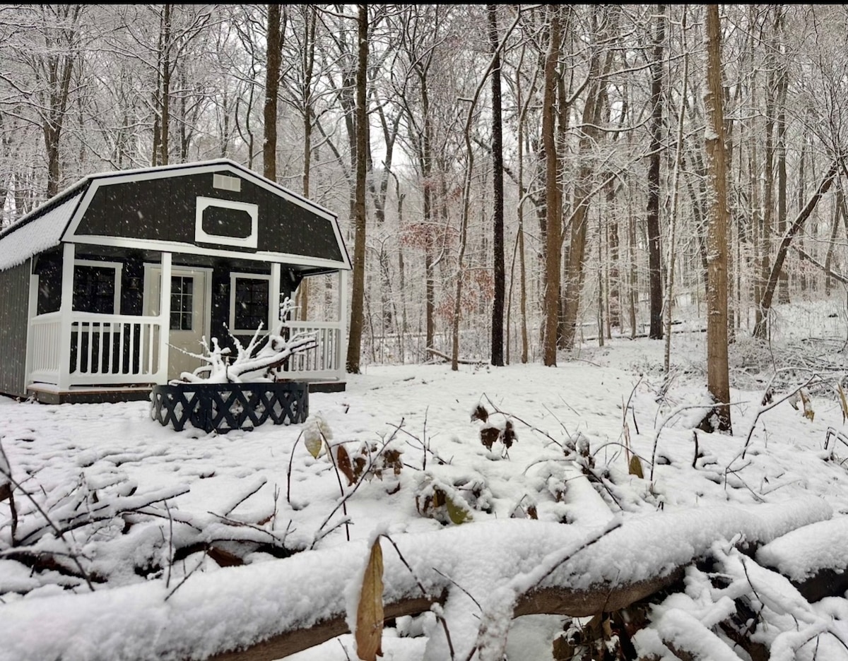 **DECORATED FOR CHRISTMAS!!** Relax with the whole family at this peaceful place to stay. Play in the creek bed with sand toys while listening to a variety of birds. Walk in the woods and connect with nature or enjoy sitting on the porch with a cup of coffee. This is a primitive cabin to relax and unwind. There is a bathroom inside the cabin & an outdoor shower. A glampers dream! (Also a YMCA and free showers at JJ's Truck Plaza nearby) Board games are stocked for quality time together.