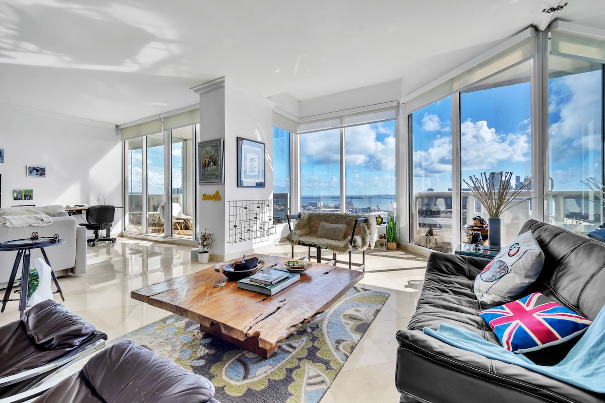 Top floor modern designer Penthouse, two bedroom, two bath, right in the heart of Miami. Enjoy style, convenience, and breathtaking views of Miami from your private wrap around balcony & take in panoramic vistas of the ocean, yachts and city. Kitchen features new stainless-steel appliances. Living room boasts brand new 4K Smart TV with dinning area. Master Bedroom has ultra comfy king size bed + en-suite, stylish Queen room both with smart TV’s. Brand new bathrooms, washer & dryer in Penthouse