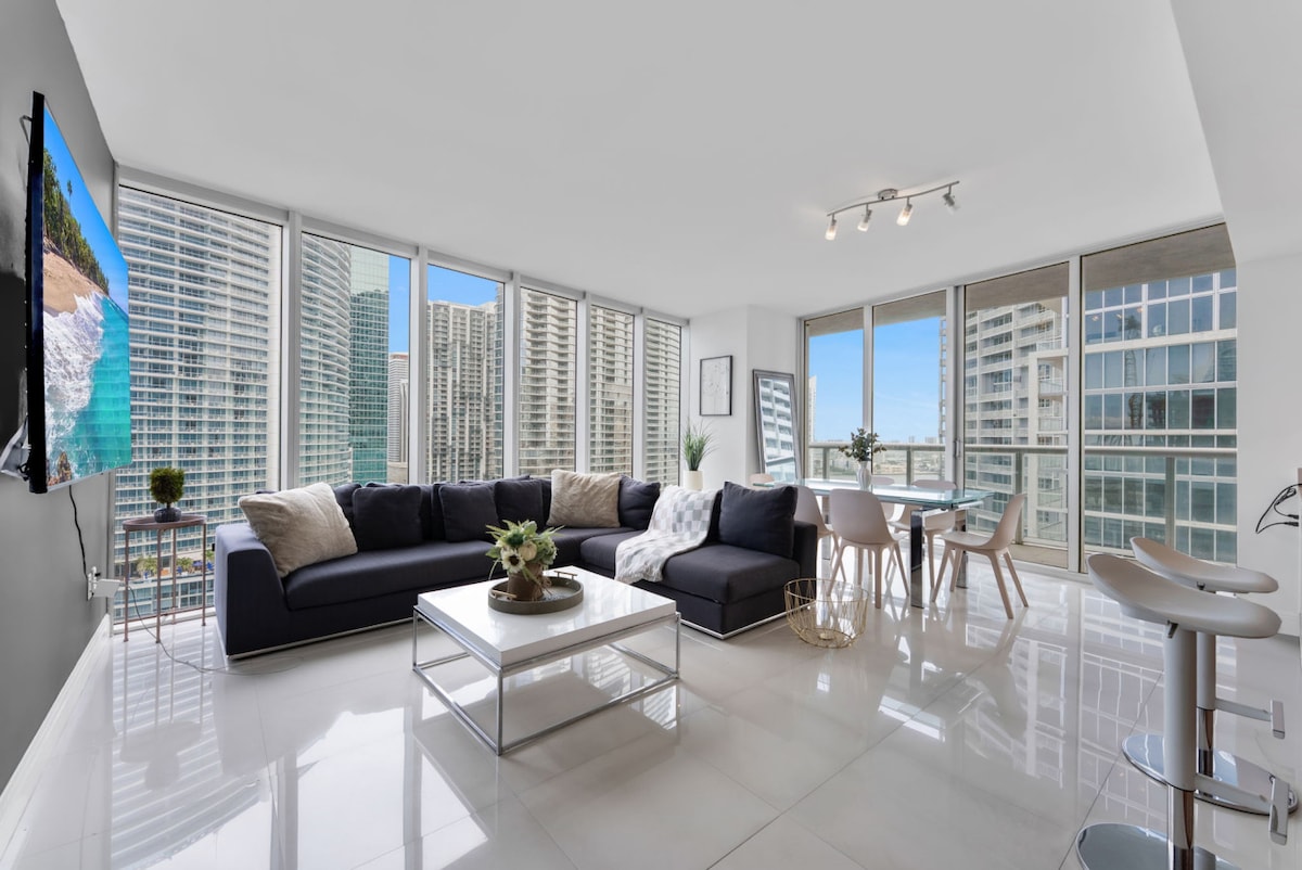 * Amazing Views*, *Top Location* 2 BR condo with stunning views, open balcony (no construction) from the 47th floor of the luxurious Icon Brickell. Right next to beautiful Biscayne Bay, Brickell Key, restaurants, clubs and shopping. Easy walk to Kaseya center and BayFront Park. This romantic full kitchen luxury condo provides you a panoramic view of the bay and Brickell skyline, watch the sunrise and sunset from your balcony, living room and main bedroom.