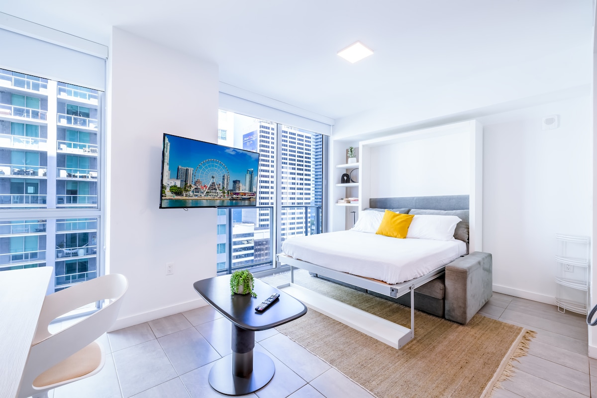 迷人的单间公寓,可欣赏海湾和城市景观,免费公园/游泳池