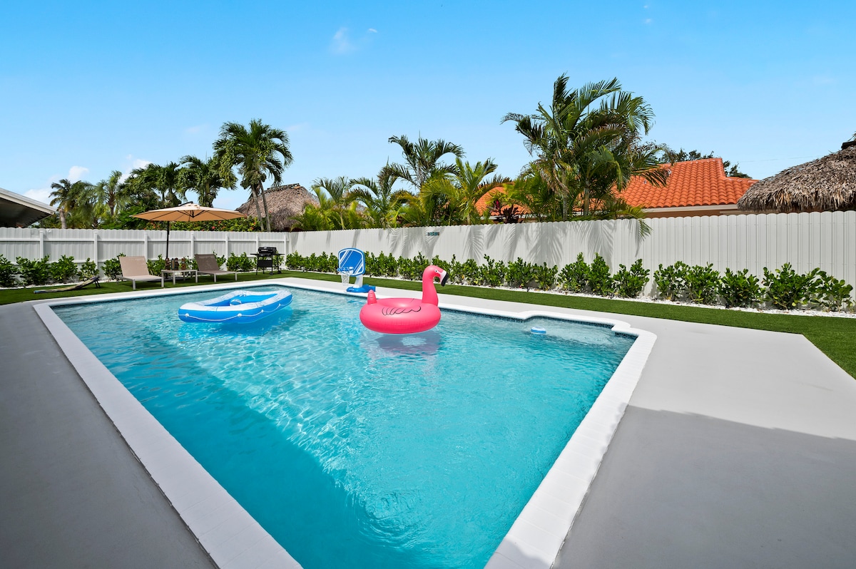 This amazing mini resort has been created with the ultimate comfort of our guests in mind. Enjoy a courtyard and pool deck designed with plenty of outdoor seating and a tiki hut. The property has synthetic grass through out, perfect for kids and family to sit and play on. Super fast Wifi. USB ports in the bedroom. Super comfortable bed. Smart Tv that you can Stream your favorite movies to. Washer/Dryer combo. Outdoor BBQ. Our home is located Minutes from downtown and Hollywood beach/ boardwalk.