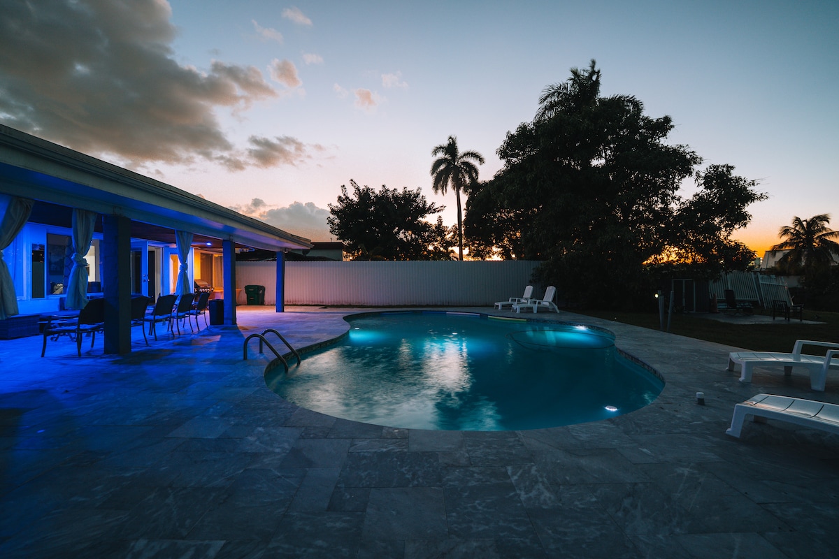 Escape to a unique Miami waterfront retreat where you can kayak from the backyard, unwind in a hot tub, and swim in a pristine Heated Pool. This quiet family-friendly haven offers a chance to spot local wildlife like ducks and tropical birds. Experience a trendy vibe, featuring a mini golf course, cornhole, pool table, multicade play system and so much more. With a clean, spacious interior and a central location near both Miami and Aventura, it’s perfect for a memorable getaway.