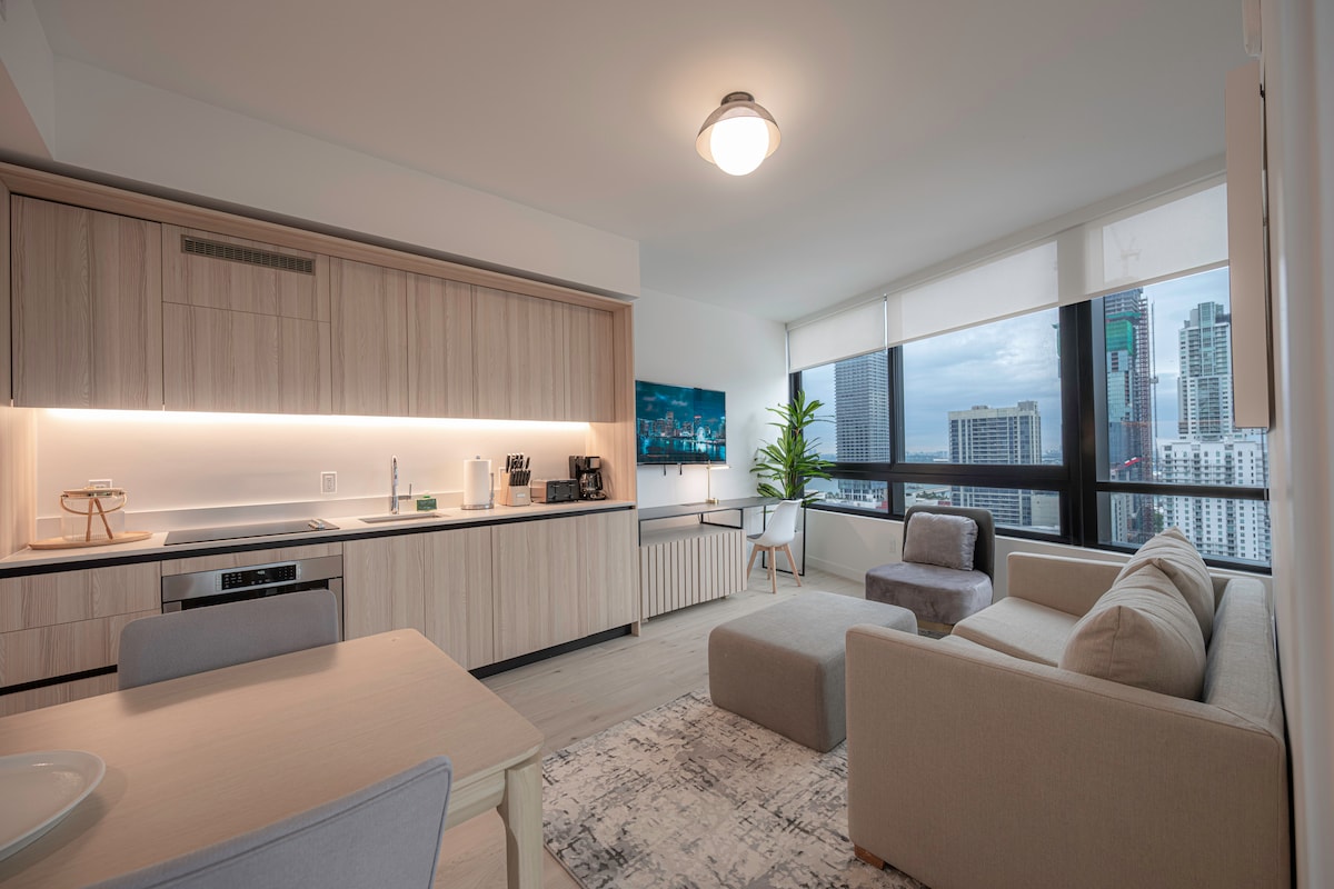 Our unique 5-star HIGH floor corner unit condo is fully furnished with an equipped kitchen located on one of the highest floors at the W Hotel which has the biggest SWIMMING POOL in Miami. We are centrally located along the Miami river with amazing sunset views. Walking distance to City Centre Mall, Whole Foods, restaurants and bars. Just a short drive to the design district & south beach. THIS IS THE PLACE TO STAY! Airport transfer, housekeeping, car rental available based on availability.