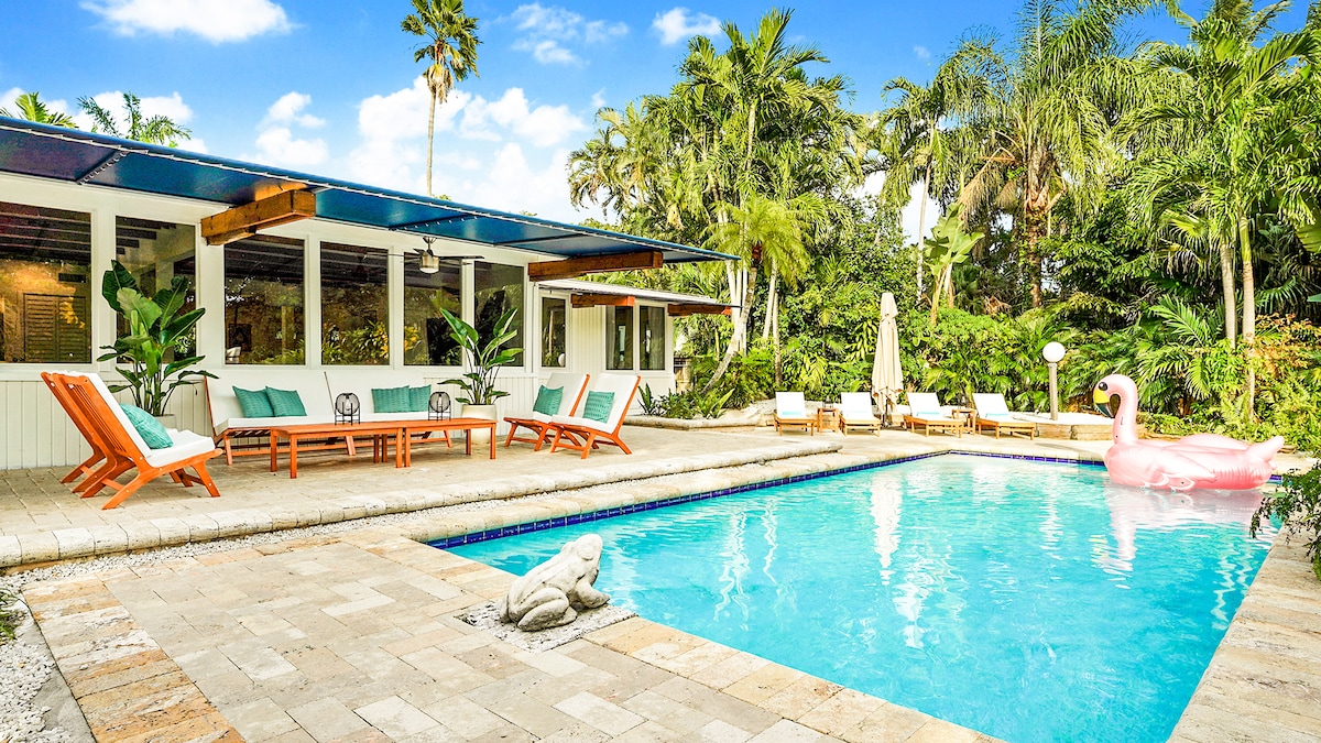 Gorgeous mid-century tropical home with spacious open layout, oversized modern kitchen & full of natural lighting. Fast WIFI for working professionals. Large backyard featuring a beautiful mature Banyan tree, high-end BBQ, tasteful outdoor seating area. The perfect setting to enjoy your vacation with friends and family! Located in a safe & peaceful neighborhood, just mins from beach, downtown & all that Miami has to offer. If you're looking for the perfect vacation, this home is ideal for you.