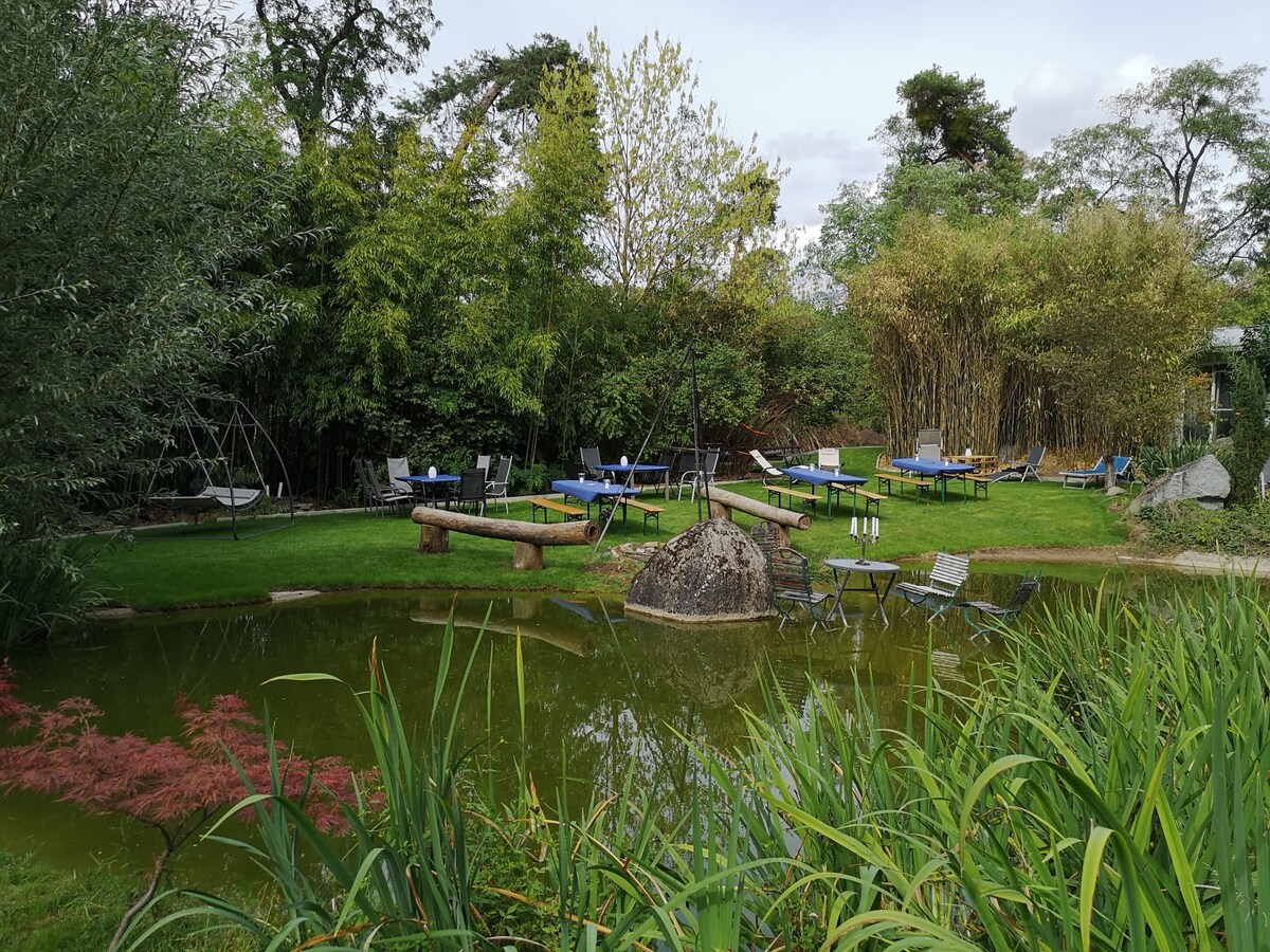 Meine Unterkunft liegt eine Stunde südlich von Frankfurt, mitten in der Natur. Gut geeignet für Gruppen und Familien die Natur suchen. Es gibt ein wunderschönes Aussengelände mit gemütlichen Sitzgruppen, Spielwiese, Lagerfeuerplatz, eine große überdachte Sommerküche, Gemüsegarten, Tischtennisplatte, Werkbank für Kinder, eine Töpferwerkstatt zum selbst Töpfern, ein Klavier in der 45 qm großen Wohnküche. Hervorragendes Wohnklima durch Holz/Lehmbauweise.