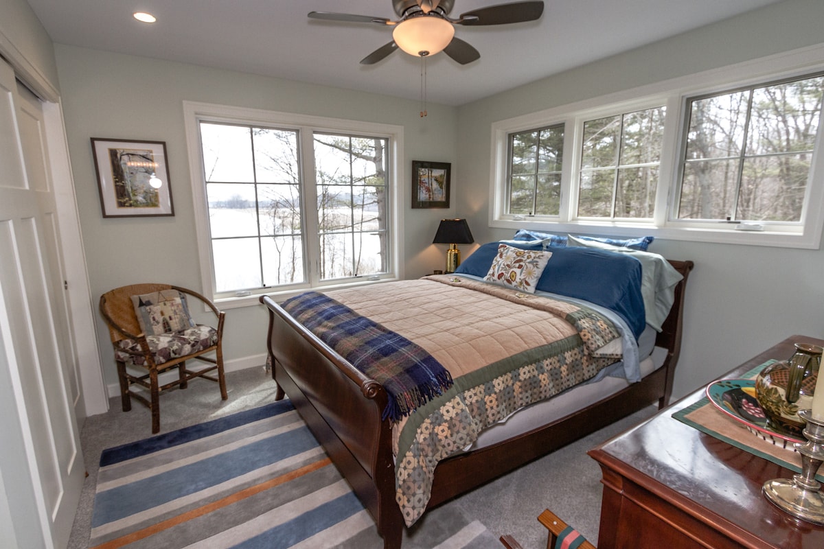 This cozy room has a built in queen platform bed, private bathroom with a new tiled shower and a barn door. It includes a delicious homemade breakfast at 8:30. We have lots of space in our home that invites you to relax, read a book, play a game, put a puzzle together, bird watch, enjoy hot cocoa by the fire or a glass of wine on the porch swing. South Haven is close by with many restaurants, beaches, hiking paths, bowling, movie theater and golfing right next door.